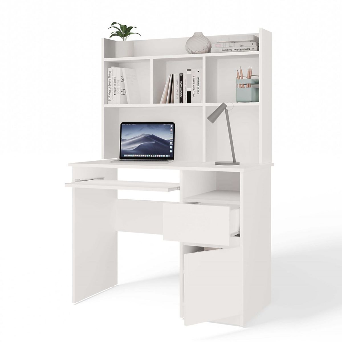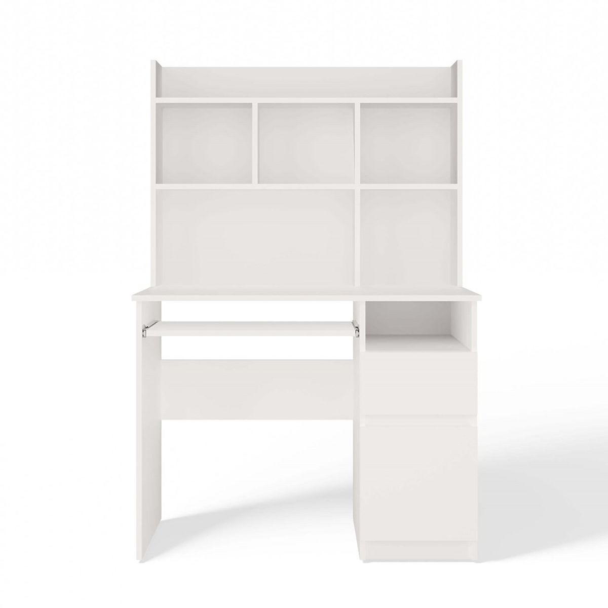 Moderen dizajn, mat bela barva in praktična razporeditev shranjevalnega prostora naredijo to pohištvo primerno tako za mladinske in otroške sobe kot za domačo pisarno.