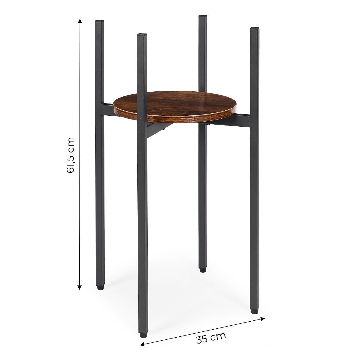 ODPORNI MATERIALIStojalo za rože je izdelano iz jekla s prašnim premazom, kar zagotavlja odpornost proti koroziji in mehanskim poškodbam. Polica iz iverne plošče je dokončana v barvi, ki posnema naravni les, kar poudarja dekorativni, loftovski značaj pohištva.