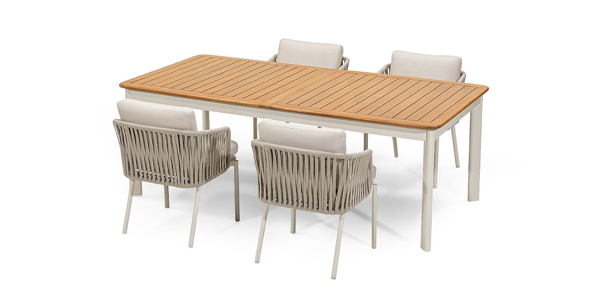 Vrtni set Porticato je kvintesenca modernega dizajna in udobja uporabe. Sestavljen je iz raztegljive mize in štirih stilskih stolov, ki skupaj ustvarjajo funkcionalen in estetski prostor za počitek na svežem zraku. Svetlo bež barva, kombinacija lesa in kovine ter skrbno izbrani detajli zagotavljajo, da set popolnoma ustreza tako zeleni vrtu kot moderni terasi. Tako miza kot stoli Porticato imajo lahko, a hkrati trdno konstrukcijo iz aluminija, prašno lakiranega v svetlo bež barvo. Ta rešitev zagotavlja odpornost proti koroziji in mehanskim poškodbam. Raztegljiva plošča mize, izdelana iz trpežnega akacijevega lesa z obdelavo v videzu tika, omogoča prosto prilagajanje dolžine glede na število gostov in priložnost. Dodatna prednost je certifikat FSC®, ki potrjuje izvor lesa iz odgovorno upravljanih virov. Stoli očarajo z izjemnim udobjem – zahvaljujoč pletenim naslonjalom iz trpežne vrvi in mehkimi blazinami iz hidrofobne tkanine. To je idealen prostor za počitek s skodelico kave, knjigo ali med dolgimi pogovori z bližnjimi. Pohištvo iz naravnega lesa ohranja njegove značilne lastnosti, zato so vse nepravilnosti, odrgnine, praske, grče, razpoke, reže, luknje, vdolbine, neenakomerne robove, raznolike vzorce, barvne razlike in druge nepravilnosti v strukturi namerno ohranjene med proizvodnim procesom. Te lastnosti poudarjajo avtentičnost materiala, vsakemu našemu izdelku dajejo edinstven značaj, kar lahko vodi do razlik v videzu v primerjavi s predstavljenimi fotografijami. Da bi set ohranil svoj popoln videz dolgo časa, priporočamo, da ga v zimskem obdobju shranite na suhem in zračnem mestu pod nadstreškom, s čimer mu zagotovite zaščito pred vremenskimi vplivi.