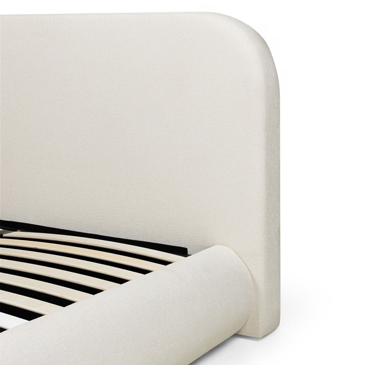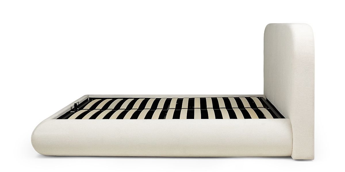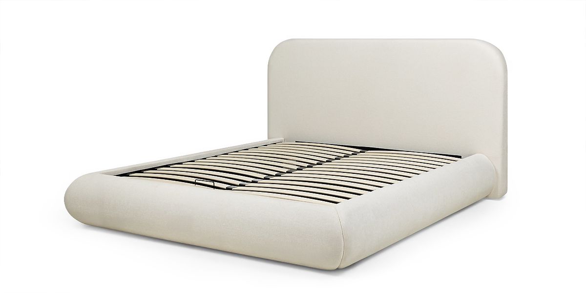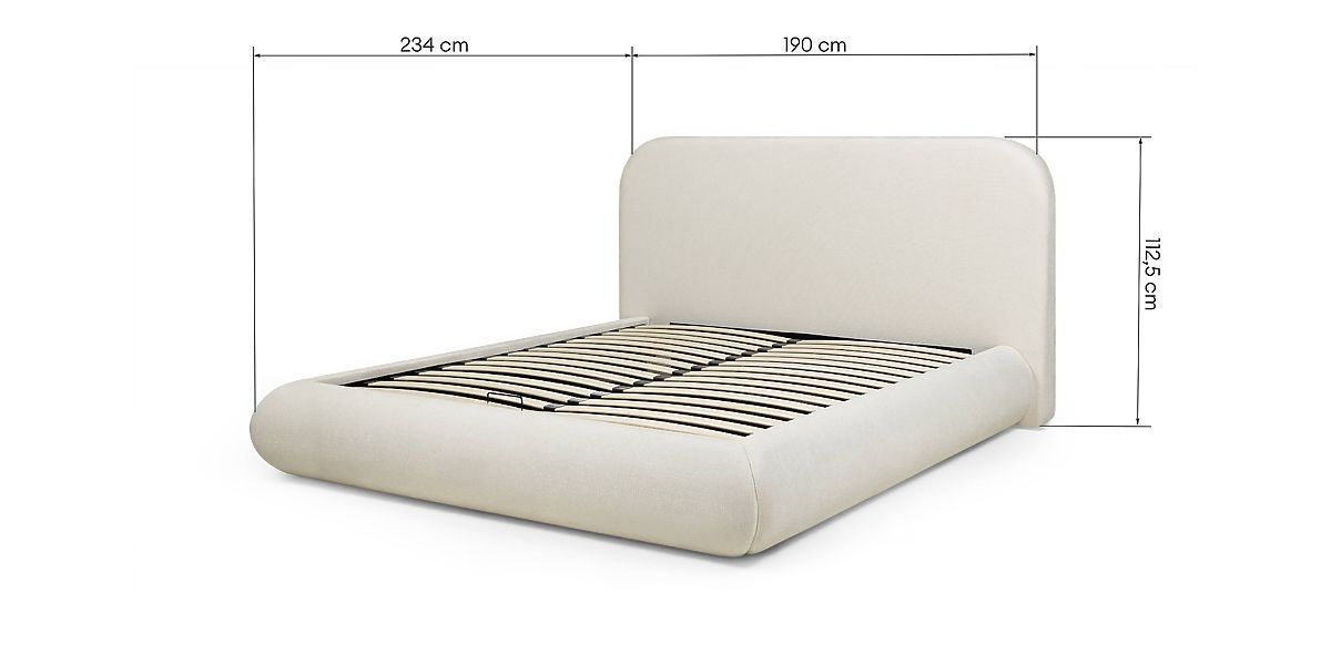 Oblazinjena postelja Lumi s skritim shranjevalnim prostorom in zaobljenim vzglavjem. .. več