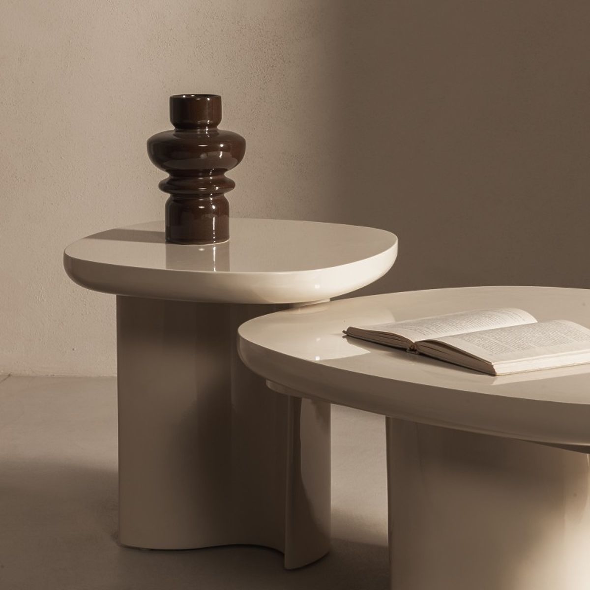 Ovalna miza Puro s svetlo bež sijajem in edinstveno osnovo. .. več