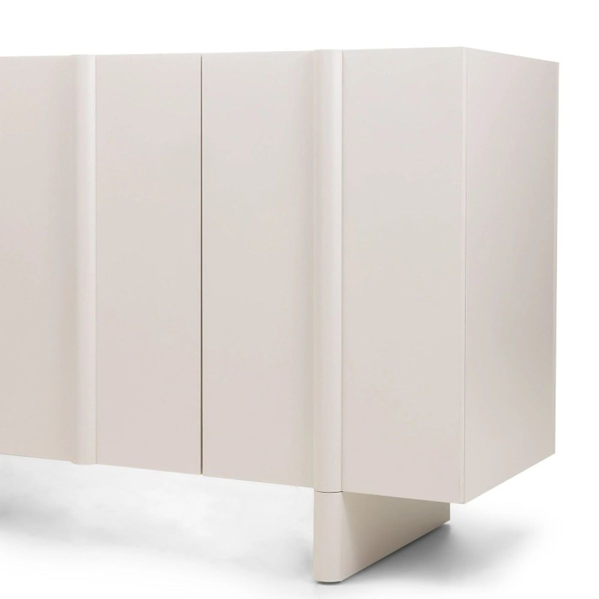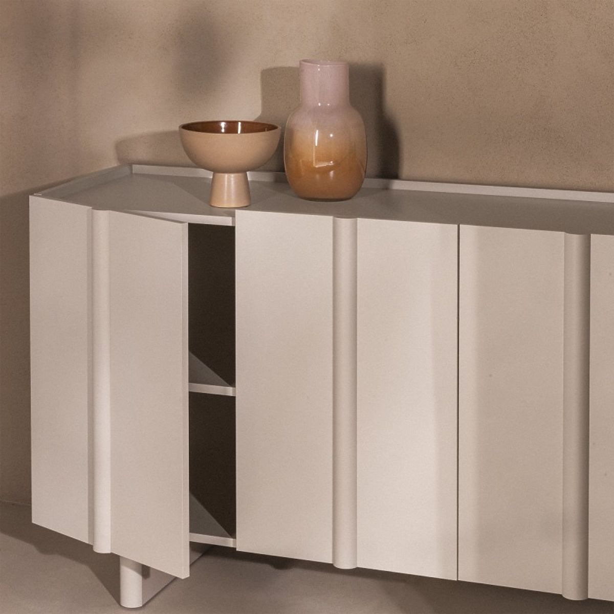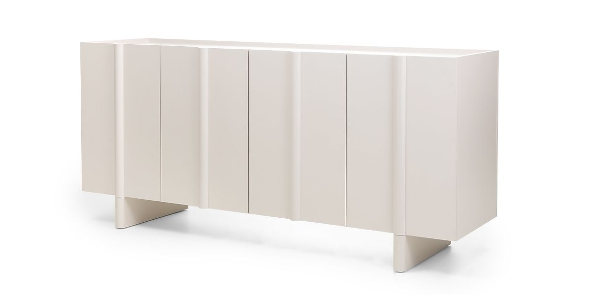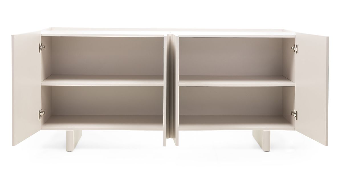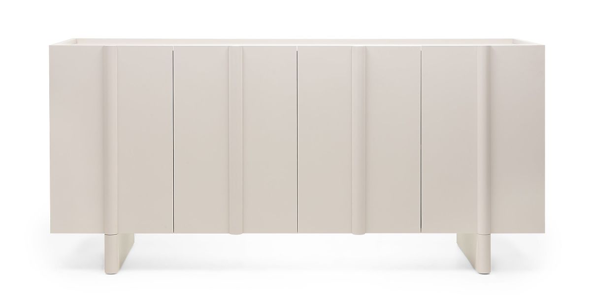 Edinstven kašmir odtenek, ki je sinonim za nežno eleganco, se zlahka prilagodi kateri koli barvni paleti in ustvarja toplo in prijetno okolje. Dekorativna zaobljenost na sprednjih straneh daje komodi mehkobo in sodoben značaj, hkrati pa zmehča vzdušje celotne sobe.