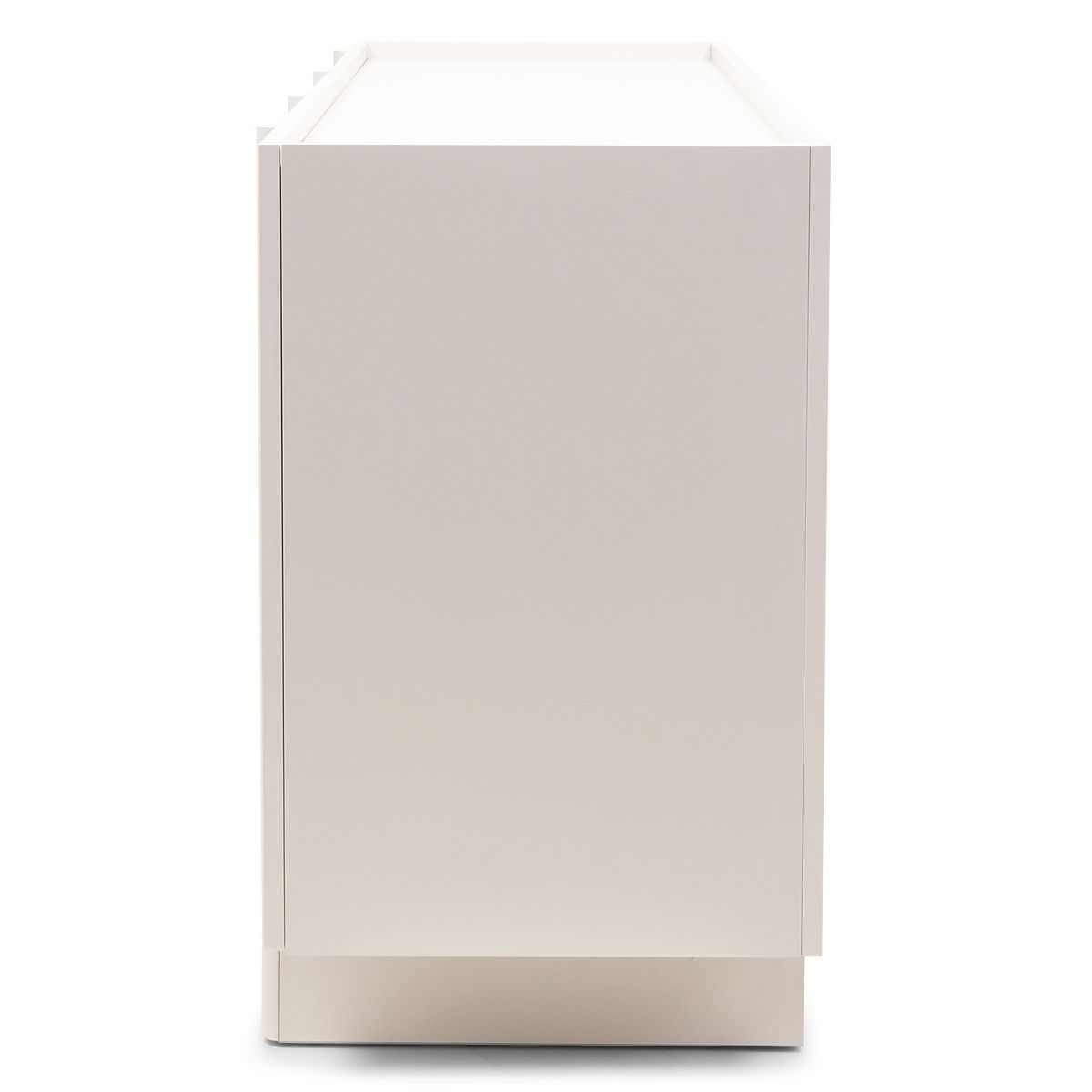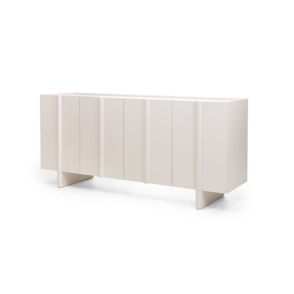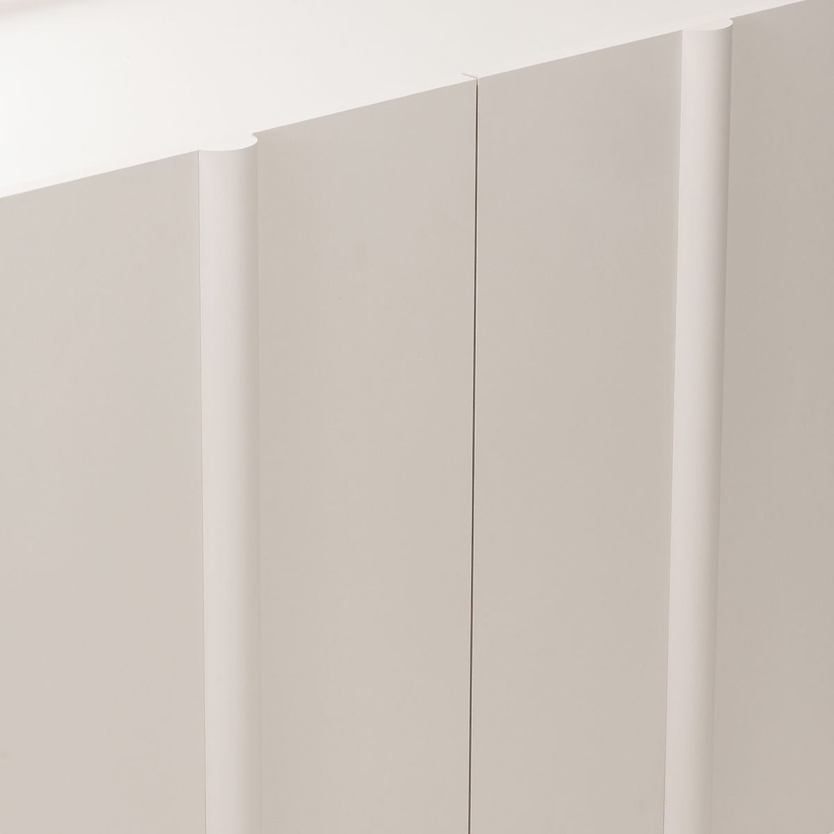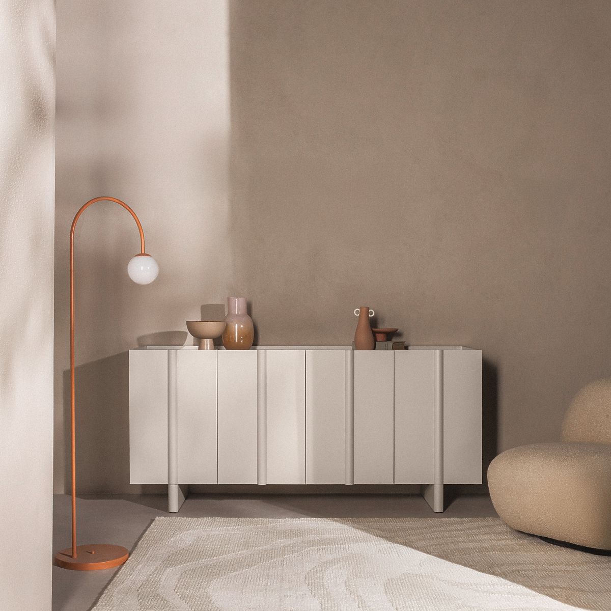 Edinstven kašmir odtenek, ki je sinonim za nežno eleganco, se zlahka prilagodi kateri koli barvni paleti in ustvarja toplo in prijetno okolje. Dekorativna zaobljenost na sprednjih straneh daje komodi mehkobo in sodoben značaj, hkrati pa zmehča vzdušje celotne sobe.