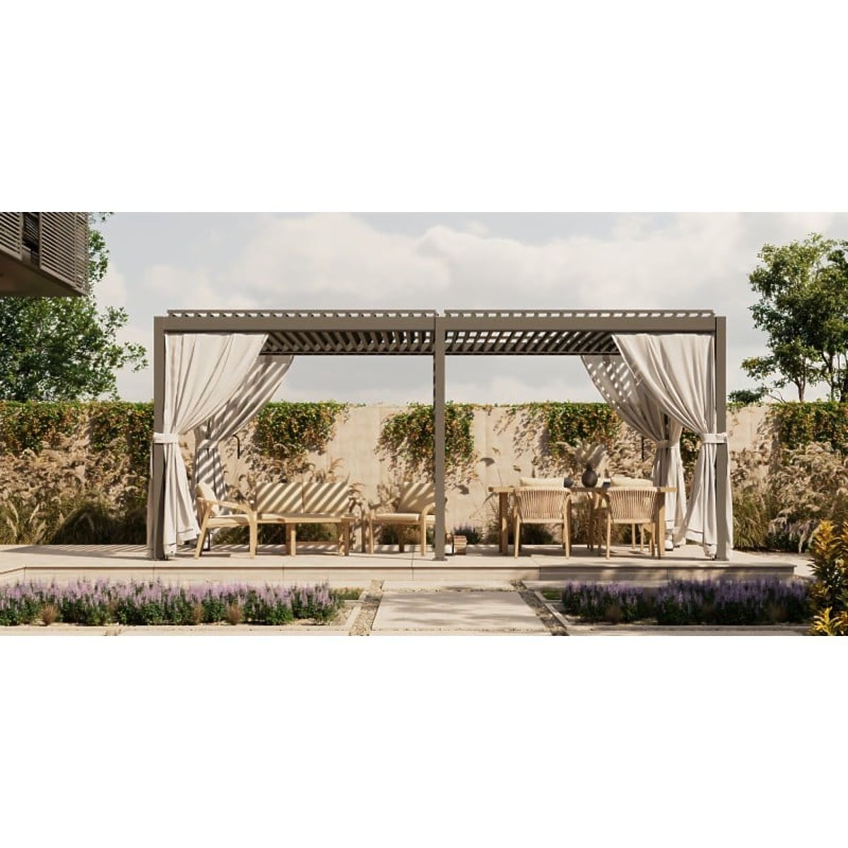 Odkrijte neomejene možnosti sprostitve in preživljanja časa na svežem zraku z vrtno pergolo Antilla! Ta prostoječa konstrukcija iz trdnega aluminija ne le da dodaja eleganco in funkcionalnost vašemu vrtu, ampak tudi ustvarja prostor za počitek in ustvarjanje nepozabnih trenutkov z bližnjimi. Njena impozantna dimenzija - 6x3 m - ponuja veliko večjo funkcionalnost in prilagodljivost uporabe v primerjavi z manjšimi modeli. Velika prostornost omogoča razdelitev na različne dele, npr. jedilni in počivalni, ter ustvarjanje udobne sprostitvene cone, obogatene z inovativnimi rešitvami, kot so avdio sistemi ali projekcijska platna za gledanje filmov. Zaradi večjih dimenzij postane pergola srce vrta ali terase, udobno sprejme počivalne garniture in vrtne sete. Takšna rešitev zagotavlja večje udobje pri družabnih srečanjih in tudi boljšo ločitev od okolice, kar povečuje občutek zasebnosti. Poleg tega lahko pergola 3x6 m zlahka sprejme dva srednje velika avtomobila, ki zagotavljata streho, ki ščiti pred dežjem, snegom in škodljivimi UV žarki. Trdnost in eleganca gresta z roko v roki - aluminijasta konstrukcija pergole Antilla ne le da očara z modernim dizajnom, ampak tudi z izjemno vzdržljivostjo. Je odporna proti koroziji in prenese veter s hitrostjo do 120 km/h ter snežno obremenitev do 60 kg/m². Njena streha je sestavljena iz premičnih lamel, katerih kot nagiba je mogoče prilagoditi vremenskim razmeram z dvema priročnima ročajema. Plošče ne le da regulirajo dostop svetlobe, ampak tudi zagotavljajo 100% vodotesnost po njihovem zaprtju, učinkovito ščitijo pred dežjem in prekomernim sončnim sevanjem. Naše lamele v pergolah so 100% aluminijaste - lahke, odporne proti koroziji in izjemno trpežne. Za razliko od jeklenih rešitev ne rjavijo in ne obremenjujejo konstrukcije. Poleg tega zagotavljajo idealno kroženje zraka, kar ustvarja udobno atmosfero pri uporabi. Premišljena konstrukcija pergole omogoča učinkovito odvajanje deževnice in vsi elementi sistema so diskretno skriti znotraj vsake od štirih nog, zaradi česar celota ohranja estetski videz. Bioklimatska pergola Antilla ima potrebne ateste in certifikate, ki potrjujejo izpolnjevanje najvišjih standardov, zaradi česar je popolnoma primerna tako za zasebne terase in vrtove kot tudi v komercialnih prostorih, kot so restavracijski in hotelski vrtovi. Pergola je namenjena samostojni montaži - v kompletu boste našli vse potrebno za ustvarjanje lastne oaze sprostitve in jasna navodila korak za korakom bodo proces montaže naredila enostaven in zadovoljujoč. Da bo vaš počitek še prijetnejši, lahko svojo pergolo opremite z dodatno plačljivimi dodatki. Zavesa iz enostavno čistljive tkanine v beli barvi ne le da zagotavlja dodatno zaščito pred soncem, ampak tudi prosojnost, kar ustvarja atmosfero lahkotnosti in svobode. In če vam je pomembna celovita zaščita, izberite rolo tipa screen. Izdelana iz tkanine, odporne na vremenske razmere, ščiti pred UV žarki, rahlim vetrom in dežjem ter insekti, hkrati pa ponuja prijetno senčenje. Lahko se odločite, kako in na koliko stenah pergole želite namestiti zavese ali rolete. Za to je treba v konfiguratorju izbrati njihovo količino in velikost, prilagojeno širini stene. Daljša stran pergole je podprta z dodatno nogo, zato bo za steno 586 cm to komplet dveh rolet in zaves širine 278 cm vsaka. A to še ni vse! Da bi se potopili v magično atmosfero večera, izberite razpoloženjsko LED osvetlitev. Lahko izbirate med tradicionalno z daljinskim upravljalnikom in kontrolno omarico ali energetsko varčno solarno osvetlitvijo, ki deluje zahvaljujoč solarnemu panelu in vgrajeni bateriji.