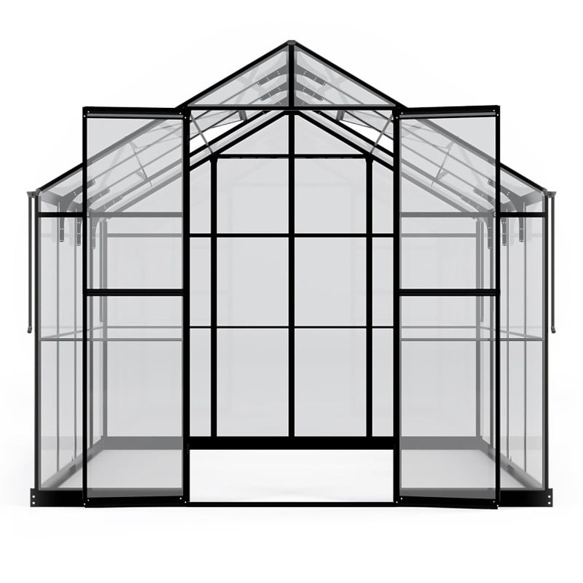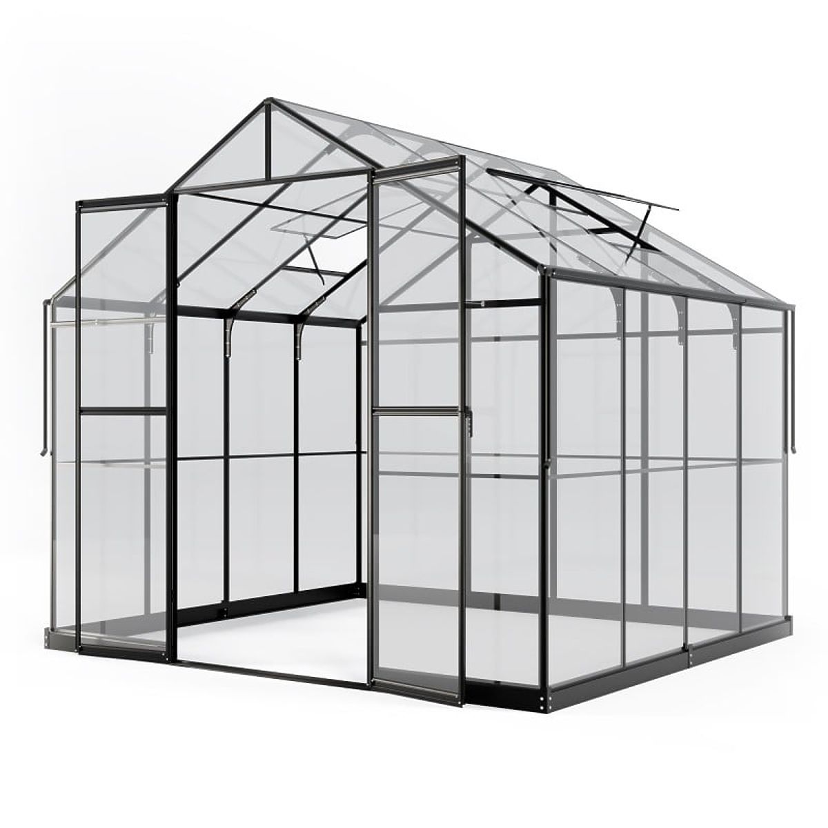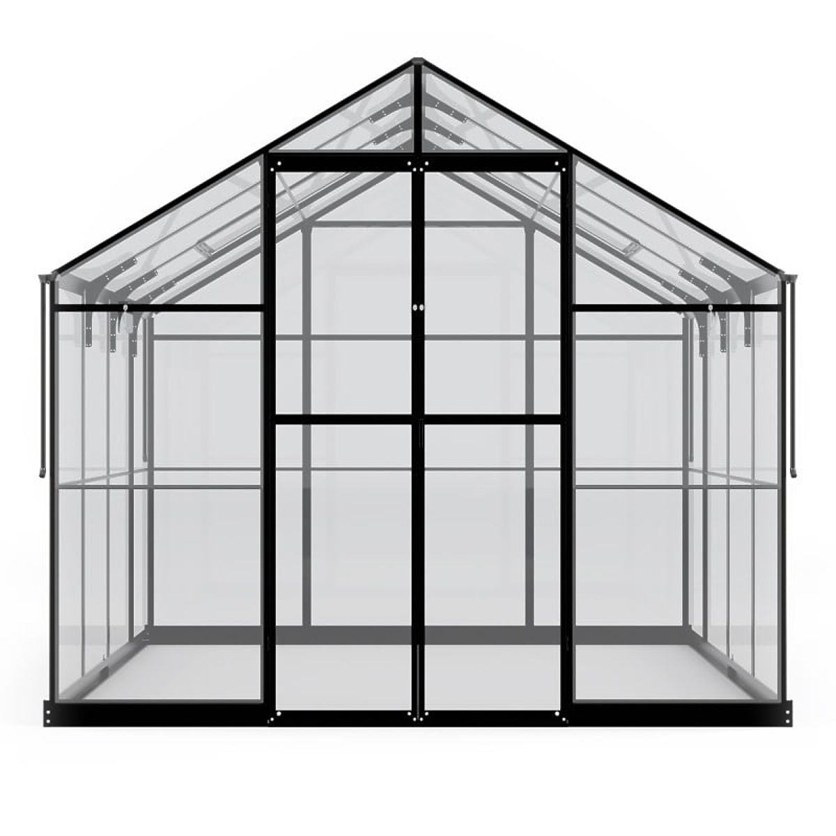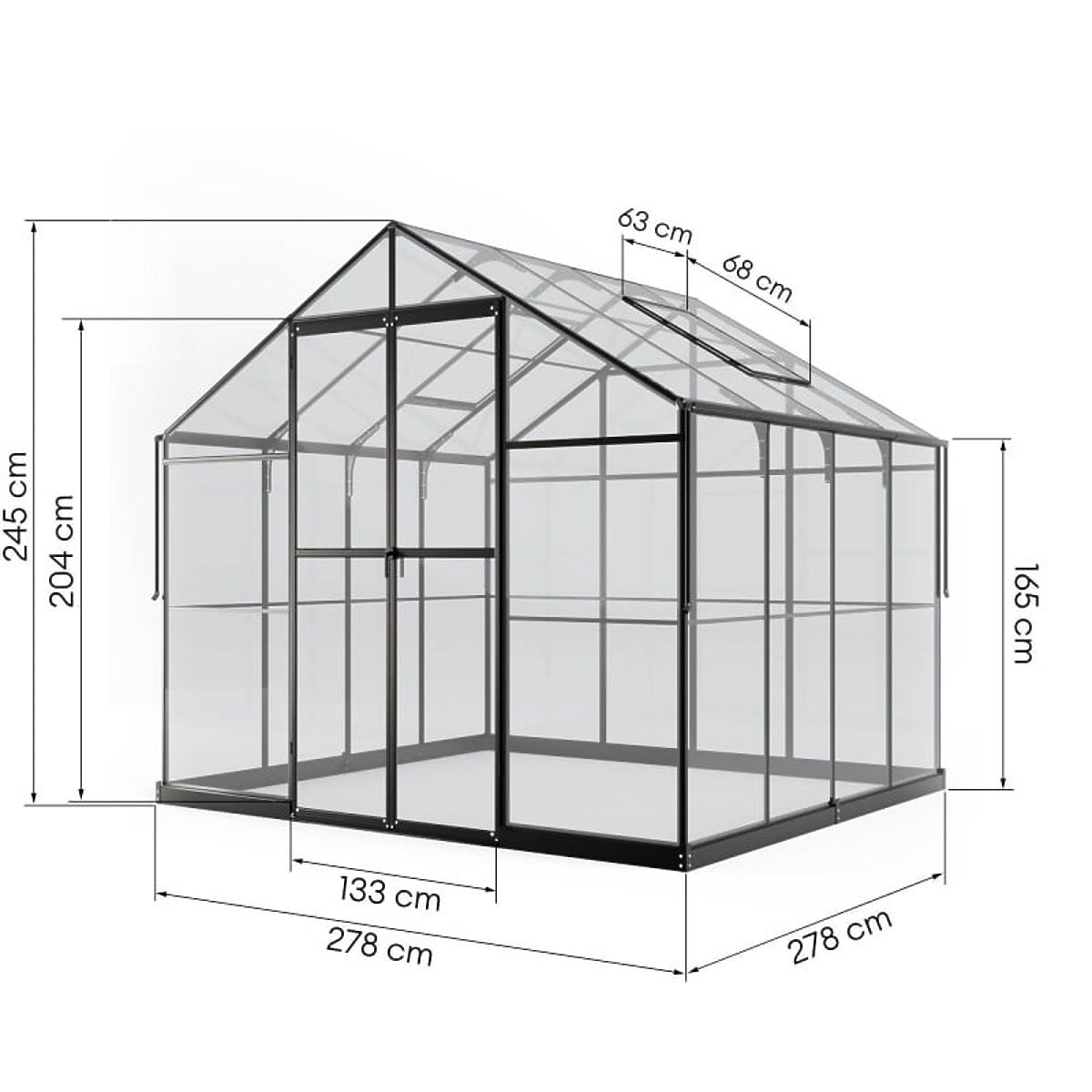 Rastlinjak ima trdno aluminijasto konstrukcijo debeline 1-1,8 mm, okrepljeno z nerjavečimi vijaki. Dodatno stabilnost zagotavlja kovinska osnova višine 12 cm. Dve nagibni okni in dvokrilna vrata z zaklepom zagotavljajo ustrezno prezračevanje, kar je ključno za zdravo rast rastlin in udobno bivanje v rastlinjaku. Nizek prag pri vhodu olajša vstop in prinašanje opreme, kot so kosilnica ali samokolnica.