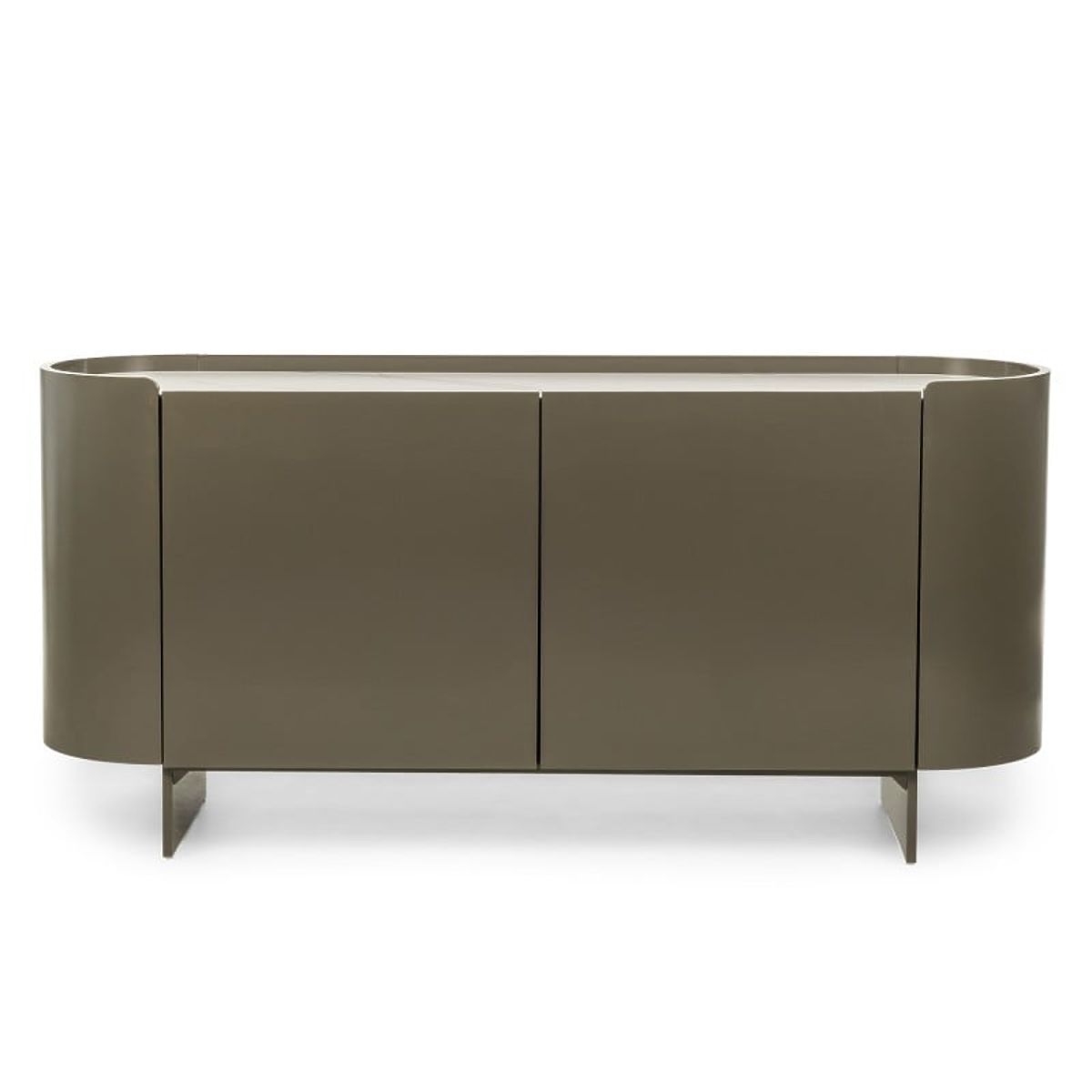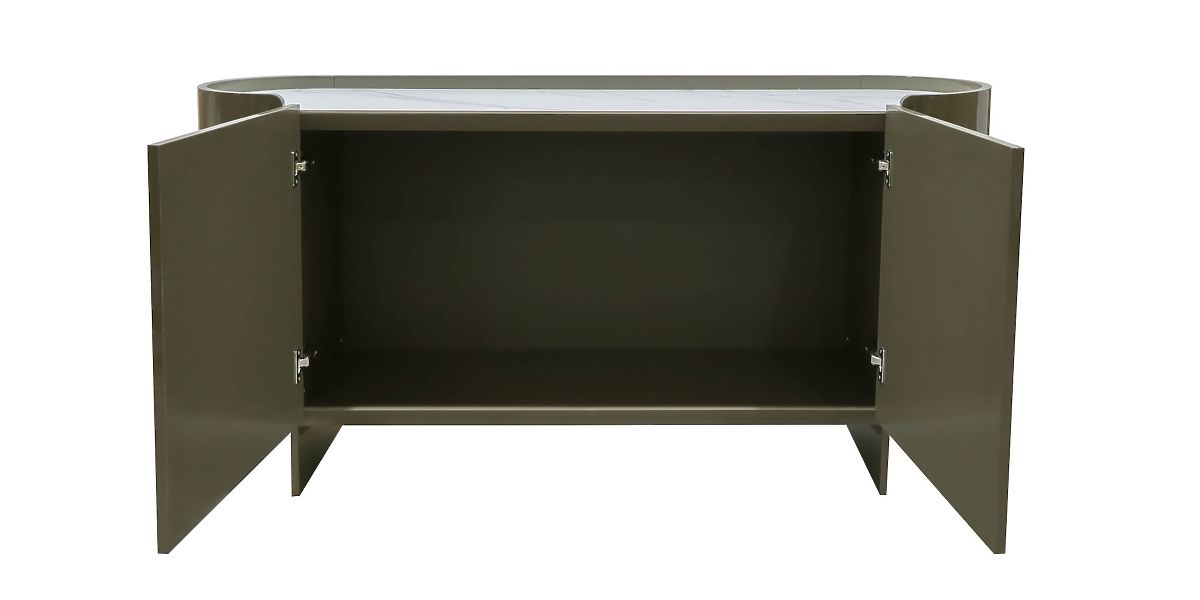 Že na prvi pogled očara - komoda Nari je popolna kombinacija modernega dizajna in brezčasne lepote. Njeni zaobljeni robovi in ovalna oblika dodajajo lahkotnost in izjemen čar. Plošča iz spieka, ki posnema marmor, se popolnoma ujema z zeleno-sivim odtenkom ohišja, kar ustvarja izrazito kompozicijo, ki pritegne poglede. Gladke, brezročajne sprednje površine poudarjajo minimalistični stil komode, celoten visok sijaj pa ji daje eleganco in sodoben značaj. Model Nari ni le o dizajnu, ampak tudi o funkcionalnosti – za vrati se skriva prostor, namenjen udobnemu shranjevanju. Če imate radi lepe interierje in ne priznavate kompromisov med stilom in funkcionalnostjo, je komoda Nari popolna izbira! Površine z visokim sijajem so bolj dovzetne za praske. Za zaščito komode priporočamo uporabo podstavkov pod postavljenimi predmeti.