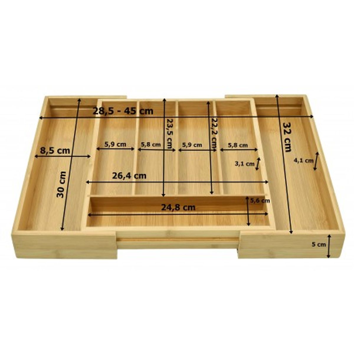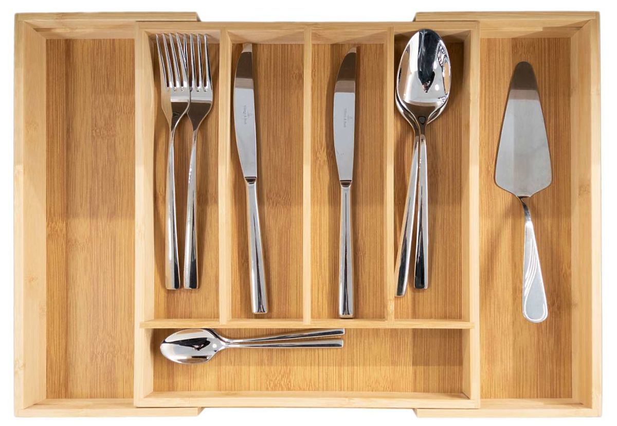 Praktičen organizator za pribor iz naravnega bambusa. Bambusni organizator je zelo prostoren. Ima do 7 praktičnih predelkov, pet za pribor in dva dodatna za nože in večje kuhinjske pripomočke. Bambusni organizator je raztegljiv, stranske predelke je mogoče po potrebi potisniti noter in tako prihraniti dragocen prostor. Z njim bo v kuhinjskih predalih red in čistoča. Njegove kompaktne dimenzije zagotavljajo, da se prilega večini standardnih predalov.