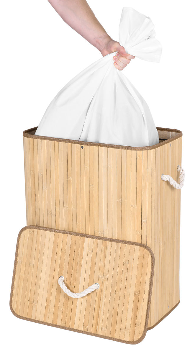 Najlepša in najbolj trpežna stilna košara za perilo s kapaciteto 100 litrov. Izdelana iz naravnega bambusa. Notranjost je opremljena z laneno vrečo s praktično pregrado za svetlo in temno perilo. Enostavna konstrukcija, trdna struktura. Skrije neprijetne vonjave. Omogoča udobno in hitro pranje.