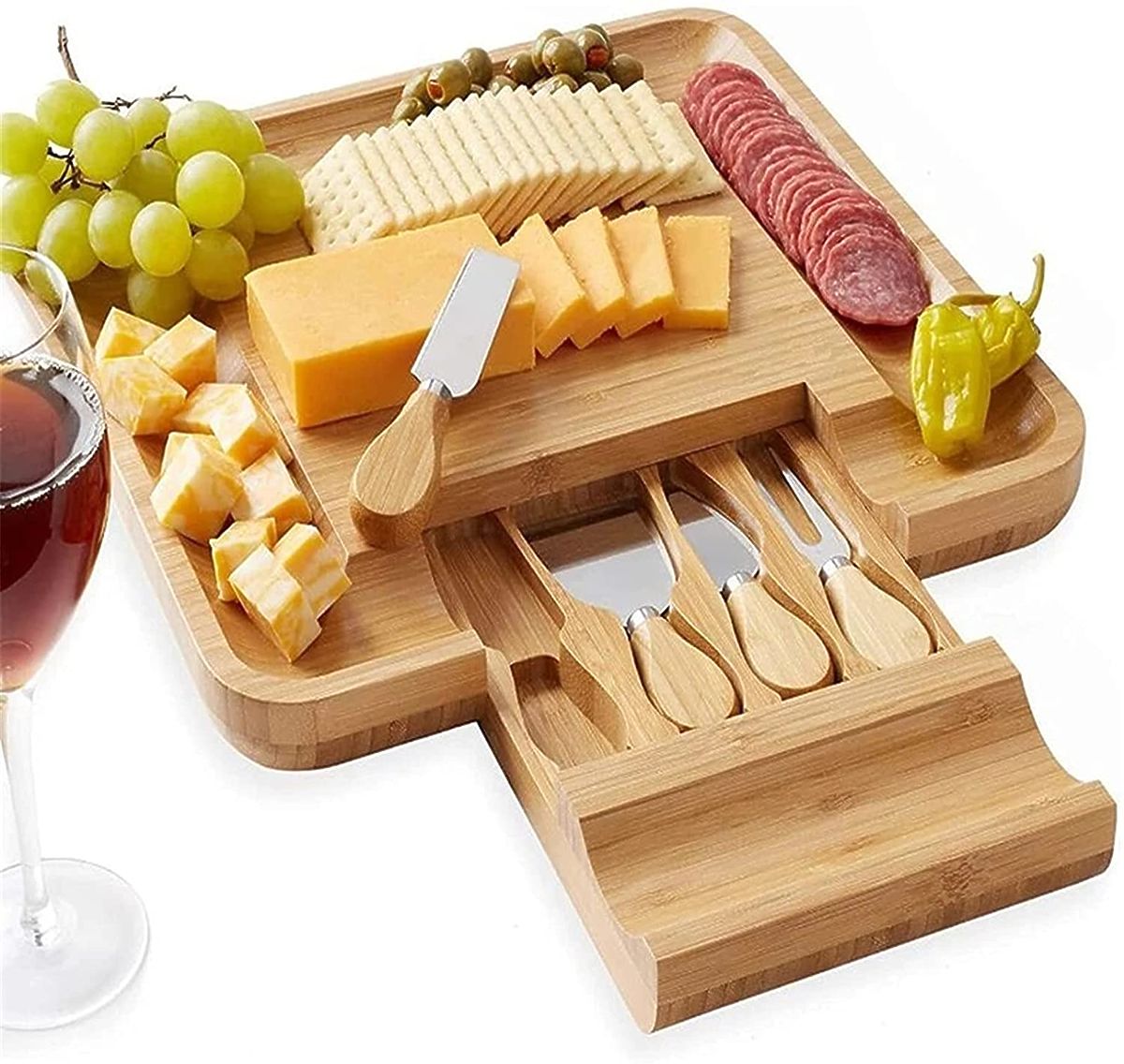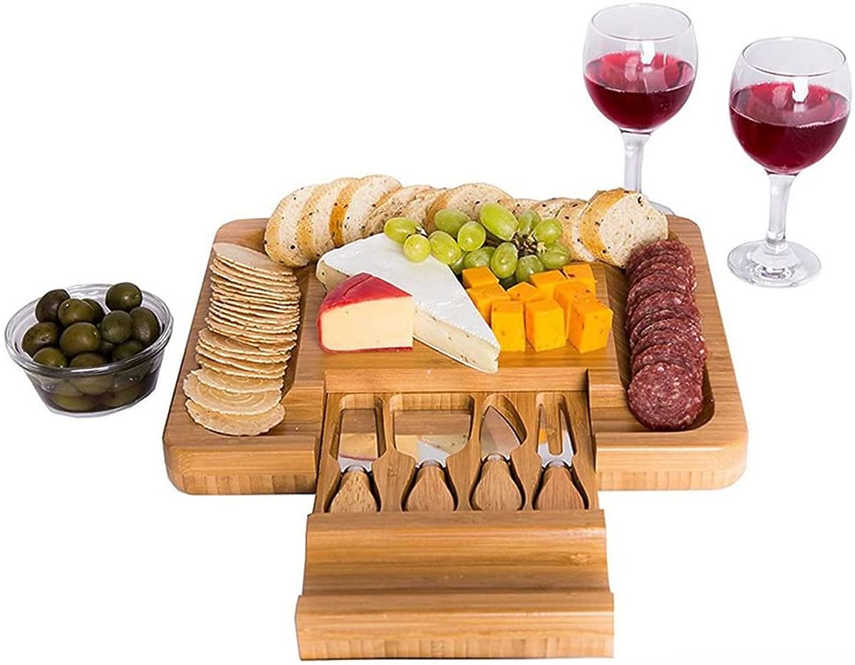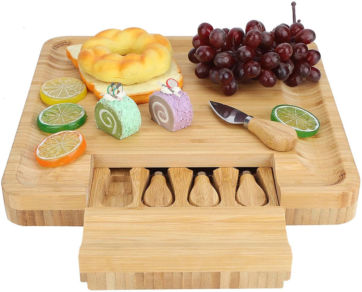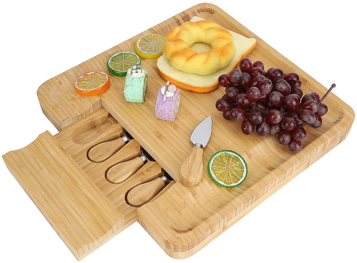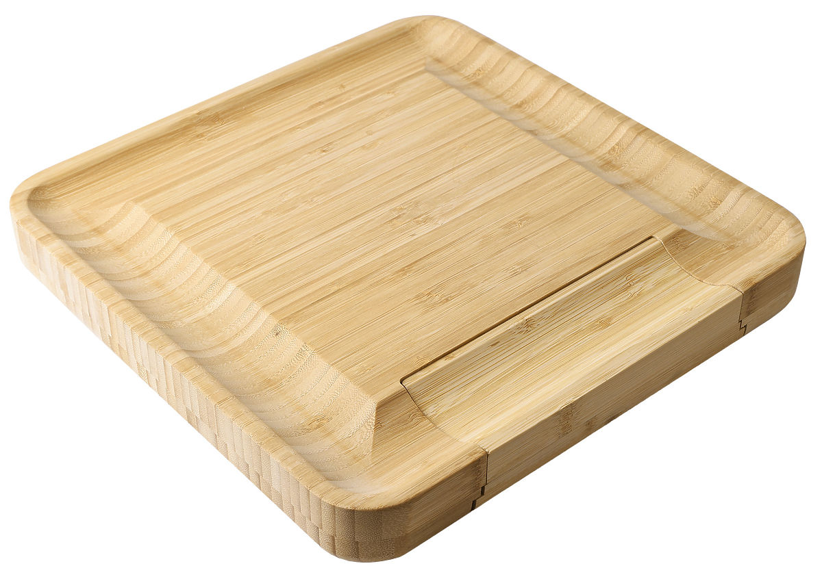 Izdelana iz 100% visokokakovostnega bambusovega lesa. Odlična ideja za darilo za ljubitelje sirov in ne samo zanje. Deska je opremljena s predalom, v katerem je komplet nožev iz nerjavečega jekla. Žlebovi na robovih omogočajo učinkovito razporeditev prigrizkov in prilog. Dodatni pripomočki olajšajo serviranje in rezanje prigrizkov ter ohranjanje reda na mizi. Deska je odlična za vsako zabavo ali srečanje s prijatelji. Bo odličen dodatek k darilu.