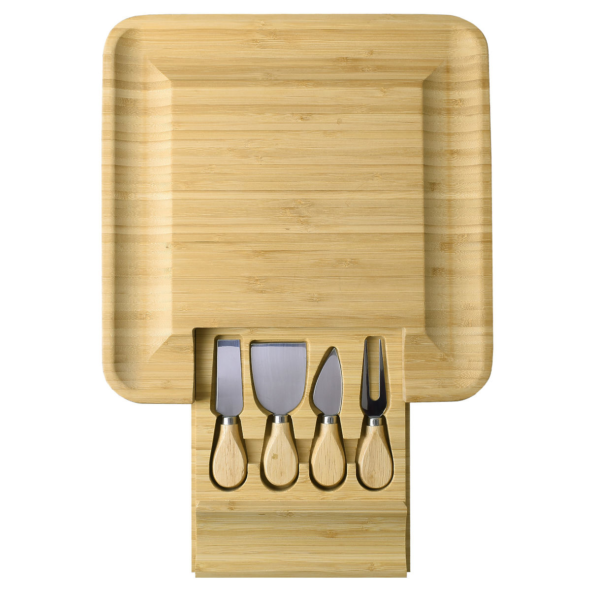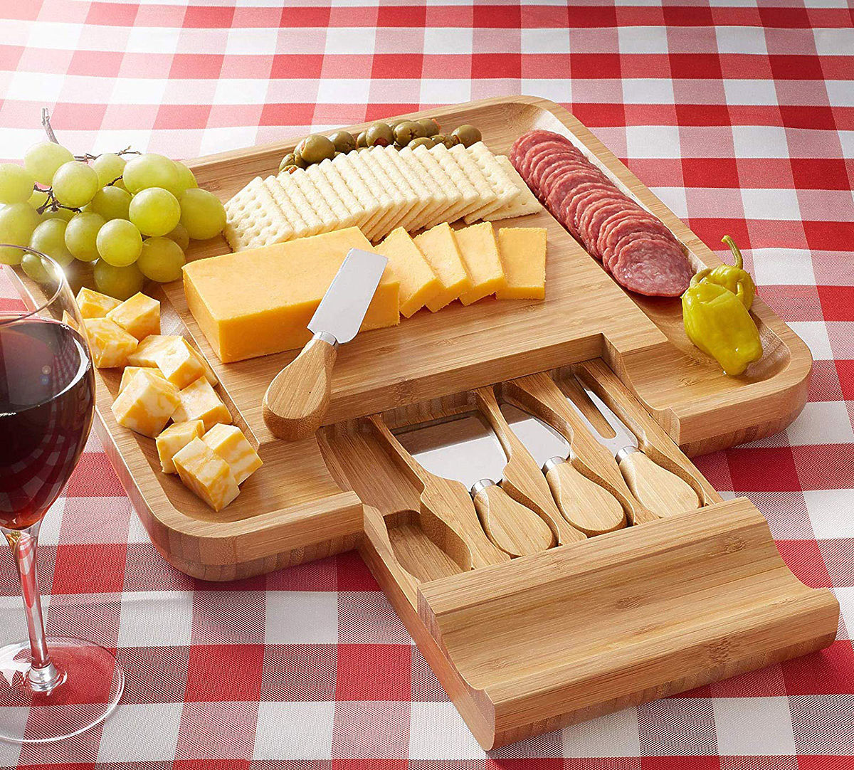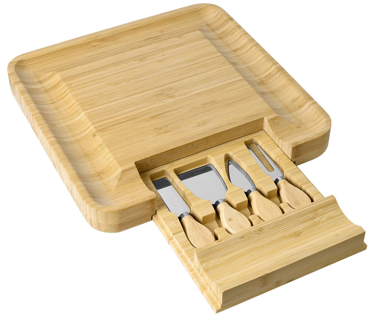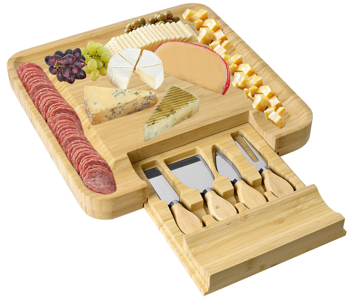 Izdelana iz 100% visokokakovostnega bambusovega lesa. Odlična ideja za darilo za ljubitelje sirov in ne samo zanje. Deska je opremljena s predalom, v katerem je komplet nožev iz nerjavečega jekla. Žlebovi na robovih omogočajo učinkovito razporeditev prigrizkov in prilog. Dodatni pripomočki olajšajo serviranje in rezanje prigrizkov ter ohranjanje reda na mizi. Deska je odlična za vsako zabavo ali srečanje s prijatelji. Bo odličen dodatek k darilu.