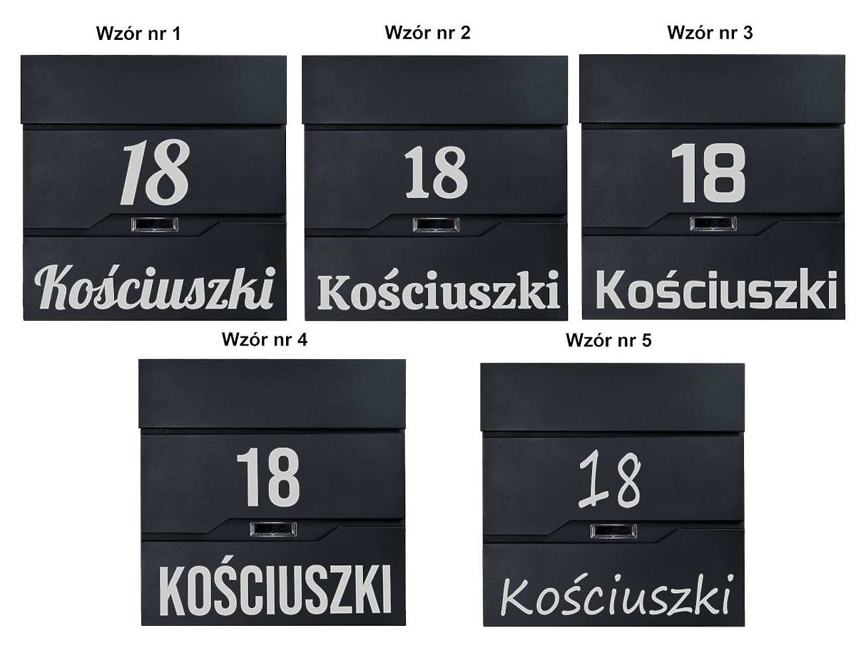 Po zaključku nakupa prosimo v sporočilu prodajalcu navedite: izbrani vzorec pisave, napis za izdelavo. (primer: vzorec2, Kościuszki 18). Napis bo izdelan natančno po navodilih iz sporočila prodajalcu. Napisi lahko vsebujejo le velike črke npr. "KOŚCIUSZKI" ali male črke npr. "cicha". Izjema je vzorec4, katerega pisava vsebuje le velike črke. Če naj bo napis izdelan s kratico ulice "ul.", prosimo, da to navedete. Poljski znaki so dovoljeni (npr.: ę,ą,ć,ś itd.).