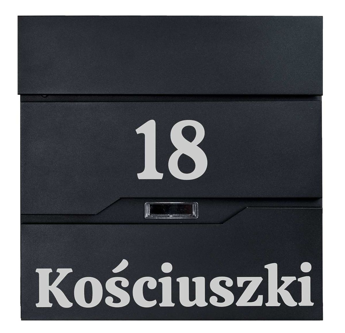 Možnost ustvarjanja poljubnega napisa: hišna številka, ime podjetja, priimek, ulica itd. Napis je izdelan z metodo ploteriranja folij Oracal, odpornih na vremenske vplive. Folija je srebrne barve.