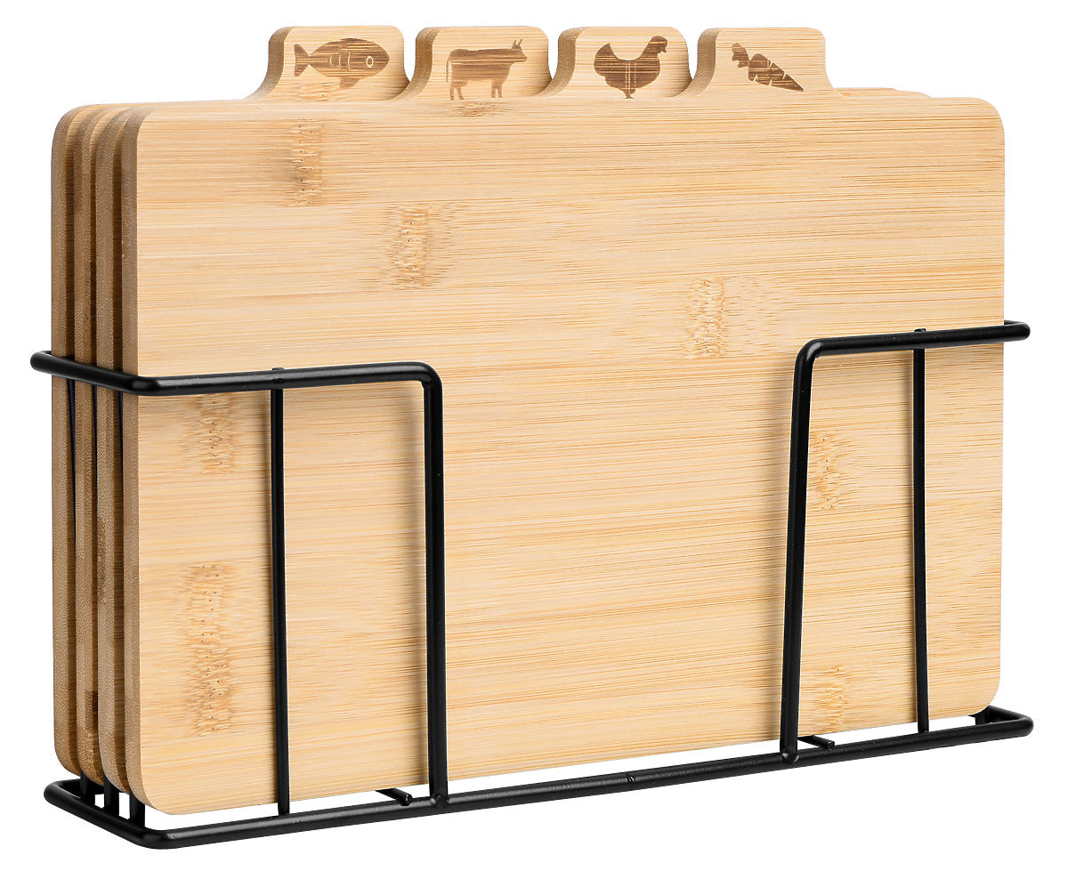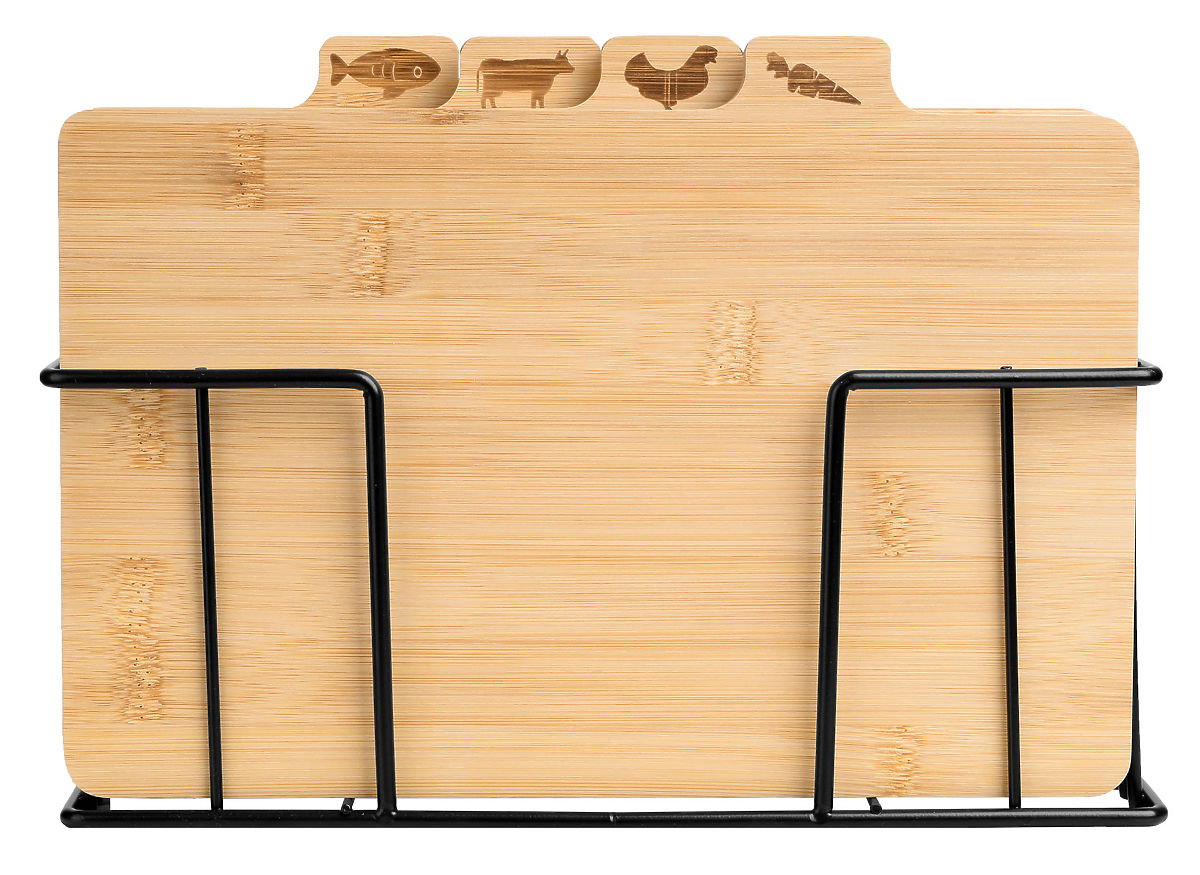 Skara je praktičen in eleganten set bambusnih desk, nameščenih na jeklenem stojalu s črnim prašnim premazom. Vsaka deska ima svoj specifičen namen. Deske so namenjene za zelenjavo, perutnino, meso in ribe. Zaradi nameščenih oznak boste imeli zagotovilo, da uporabljate pravo, namensko desko. Set zavzame malo prostora in vsaka deska bo vedno pri roki. Set zagotavlja ustrezno higieno pri pripravi jedi. Deske so izdelane iz naravnega bambusovega lesa, zaradi česar so odporne na vlago in deformacije, ne vpijajo vonjav in se hitro sušijo. Bambusov les je naravni ekološki material, varen za zdravje.