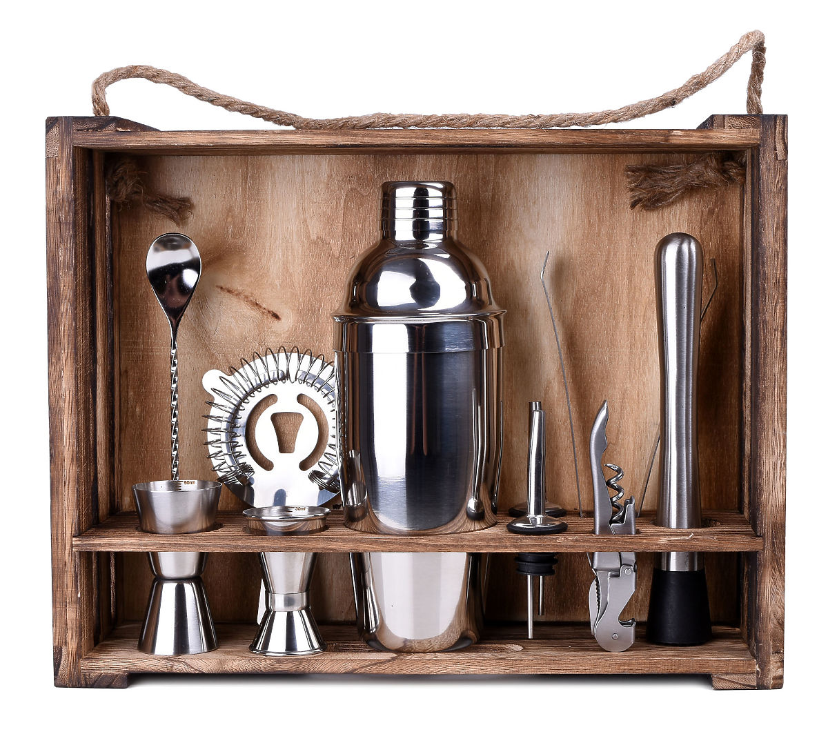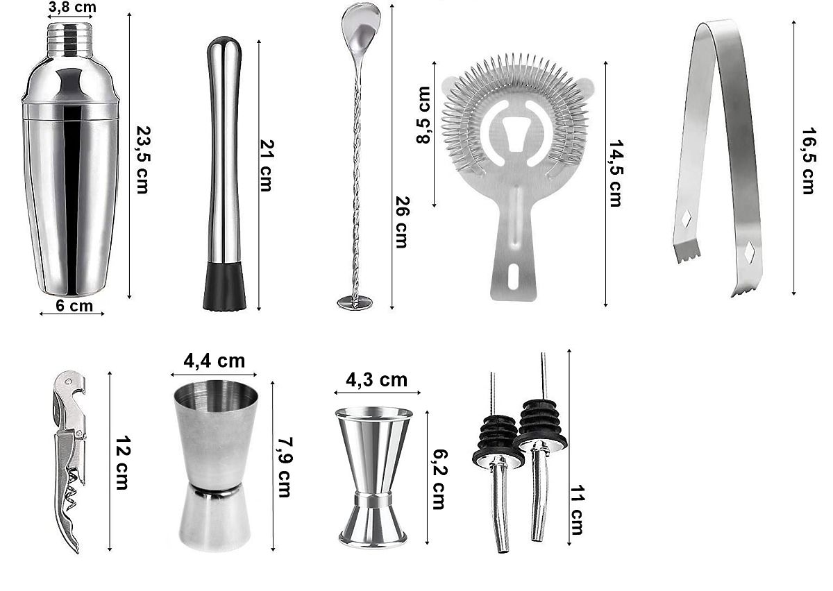 Prirejate zabavo in želite presenetiti svoje goste? Barmanski set vam bo pomagal popestriti zabavo in pripraviti izvirne, zanimive pijače. Vsak element seta je izdelan iz najkakovostnejšega nerjavečega jekla, kar zagotavlja, da ne spreminja okusa pijač. Set vsebuje kar 11 elementov: 10 nerjavečih dodatkov in stojalo iz borovega lesa, ki je bilo karbonizirano.