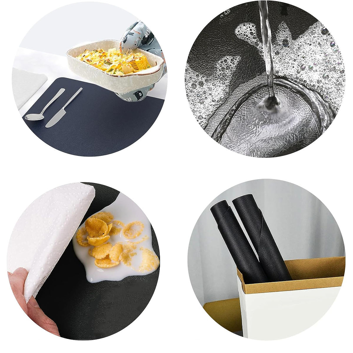 ✅ Odpornost na vodo: Podloge iz materiala ne prepuščajo vlage, s čimer ščitijo površino mize pred madeži in poškodbami zaradi vlage.