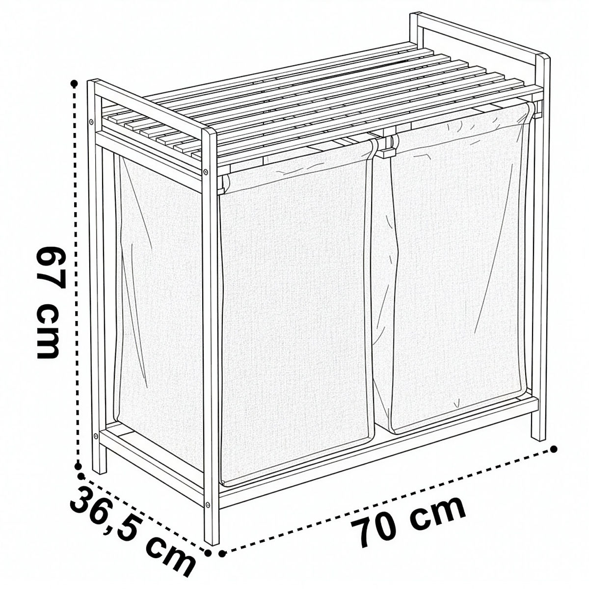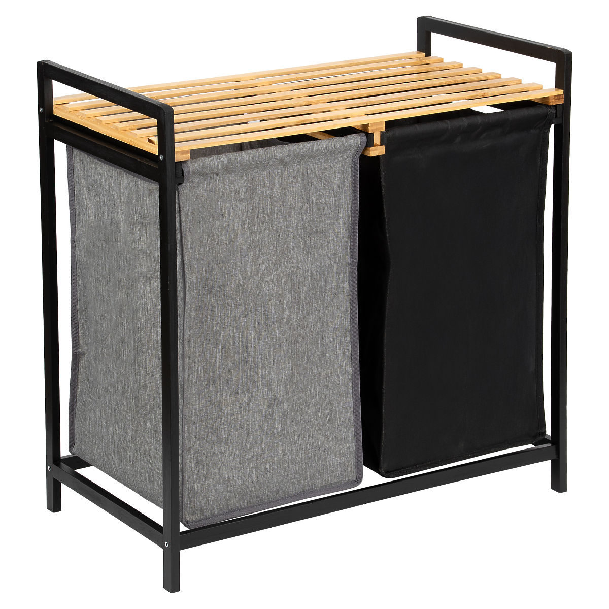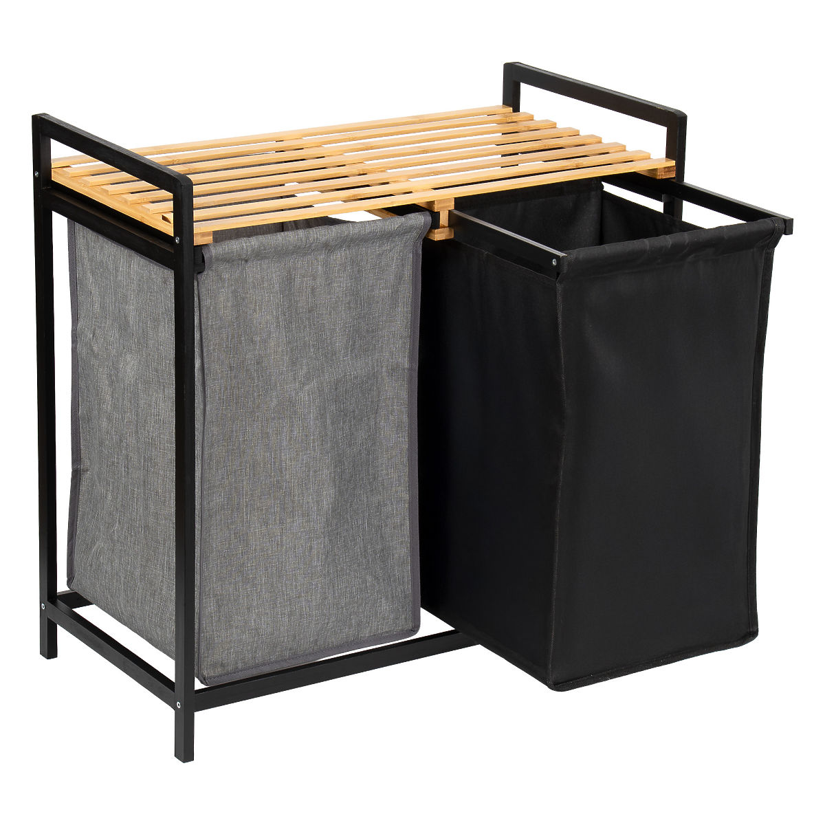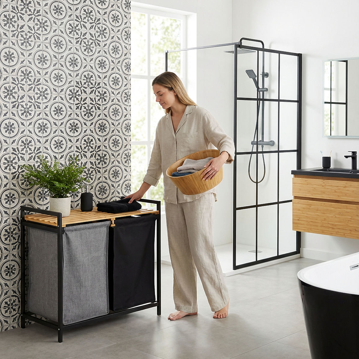 Bambusova košara za perilo Hanoi Black Duo Barva je stilska in funkcionalna rešitev za sodobno kopalnico. Kapaciteta 80 litrov in razdelitev na dva predelka olajšata ločevanje perila. Praktična zgornja polica je primerna za detergente, dodatke ali dekoracije. Tkaninske košare je mogoče enostavno izvleči, preprosta montaža brez vrtanja pa omogoča hitro pripravo košare za uporabo. Idealna za loft in sodobne interierje.