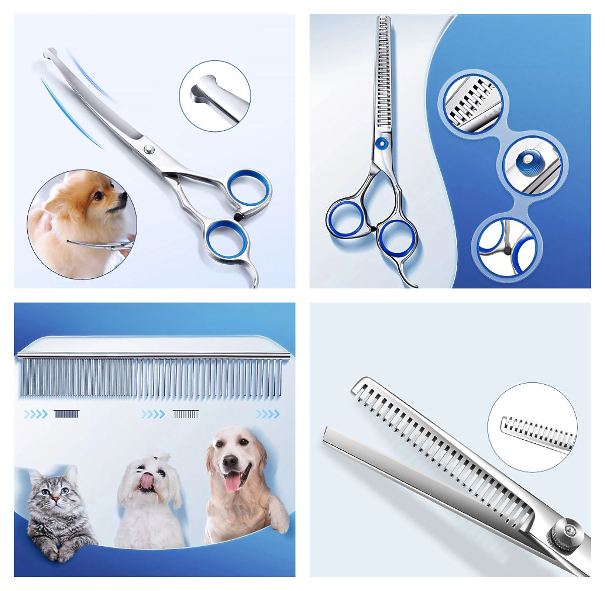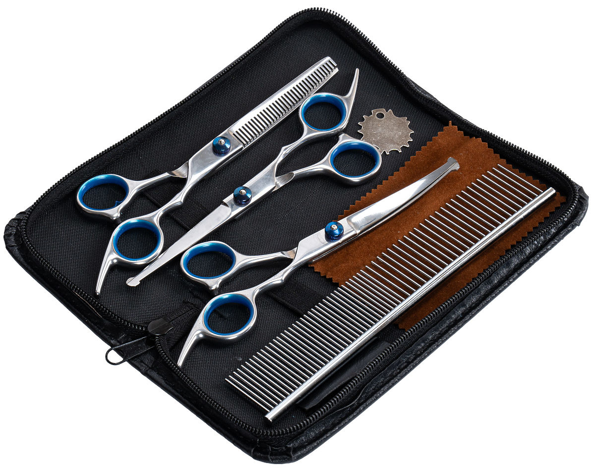 Velik set orodij: Set vsebuje različne vrste škarij, vključno z ravnimi, efilačnimi in ukrivljenimi, kar omogoča prilagoditev orodij vsaki nalogi nege. Tako lahko celovito skrbite za dlako svojega ljubljenčka, ne glede na njegove potrebe.