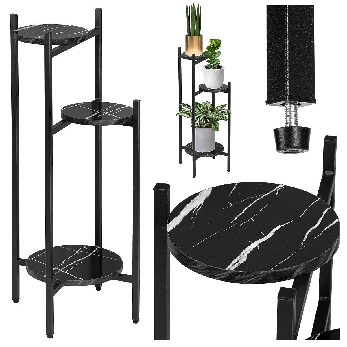Tretorri je robustno stojalo za rože, izdelano iz jeklenih profilov, lakiranih s prašno barvo, in laminiranih plošč, ki posnemajo marmor. Odlikuje ga preprost dizajn in privlačen videz, ki se prilega vsakemu sodobno urejenemu interierju v loft, modernem ali glamur stilu.