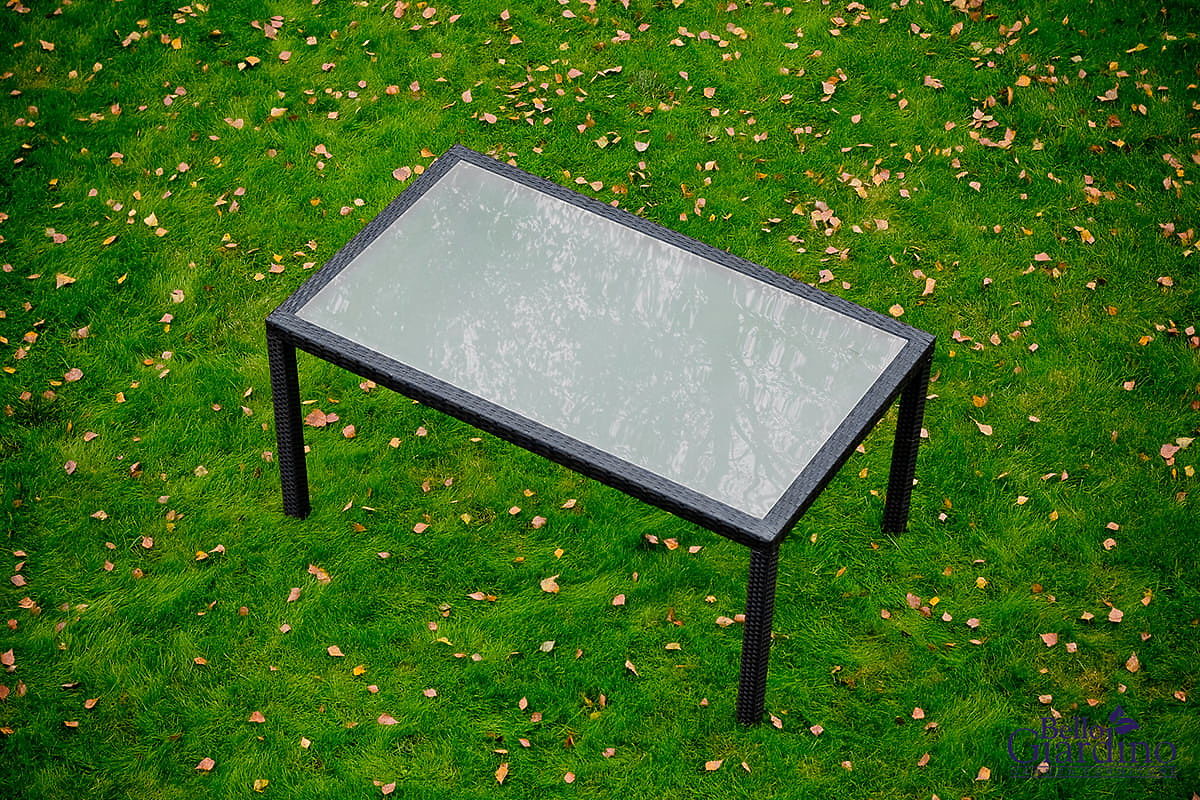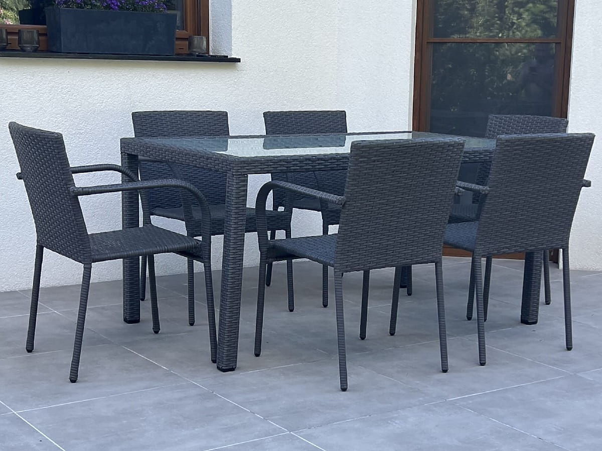 Konstrukcija pohištva: miza – aluminij, stoli – jeklo Komplet vsebuje 7 delov: 1 × miza (s mat stekleno ploščo iz 5 mm varnostnega stekla): dolžina 150 cm, širina 90 cm, višina 74 cm6 × stoli: širina 56 cm, globina 50 cm, višina 84 cm, višina sedeža od tal 44 cm, višina naslonjala od sedeža 43 cm, širina sedeža 40 cm, globina sedeža 43 cmKomplet je dostavljen na 1 paleti z dimenzijami 120 × 80 × 170 cm, teža 60 kg. Možnost nakupa blazin za stole tukaj. Stole je mogoče takoj po razpakiranju uporabljati. Stoli so zložljivi (lahko jih zložite enega v drugega), kar močno olajša shranjevanje in prihrani prostor. Miza je namenjena enostavni samostojni montaži po priloženih navodilih. Mat steklena miza je vstavljena v okvir iz tehno ratana. Tehno ratan je odporen na škodljive vremenske vplive, vendar za daljše ohranjanje videza priporočamo nakup zaščitne prevleke. Prevleka v temno sivi barvi je enonamenska in ima spodnjo vrvico za zategovanje. Vse prevleke so narejene po meri, čas izdelave je približno 14 delovnih dni.