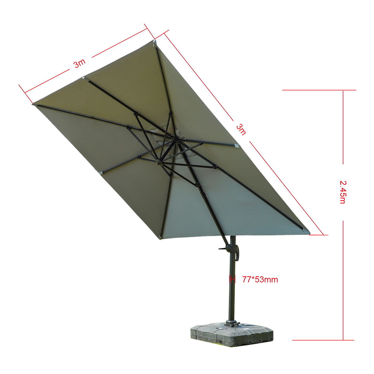 Vrtni senčnik je idealna kombinacija stila in funkcionalnosti. Velik senčnik ne le učinkovito ščiti pred škodljivimi sončnimi žarki, ampak je tudi izjemna dekoracija. Zahvaljujoč enostavni regulaciji kota nagiba lahko senčnik prilagodite svojim potrebam, kar zagotavlja maksimalno zaščito in udobje. Terasni senčnik ima prevleko iz 100% poliestra, kar zagotavlja trajnost in odpornost na različne vremenske razmere, vključno z vlago in UV sevanjem. Enostavno upravljanje s pomočjo ročice omogoča hitro zlaganje in razstavljanje, kar ga naredi idealno izbiro za vsakogar, ki ceni udobje in kakovost. Barva senčnika: ecru Oblika: kvadratna Material prevleke: 100% poliester Konstrukcija senčnika: aluminij 1 x senčnik: dimenzije: 300 cm x 300 cm višina: 245 cm Osnova senčnika je del kompleta - osnova ima rezervoar za vodo!