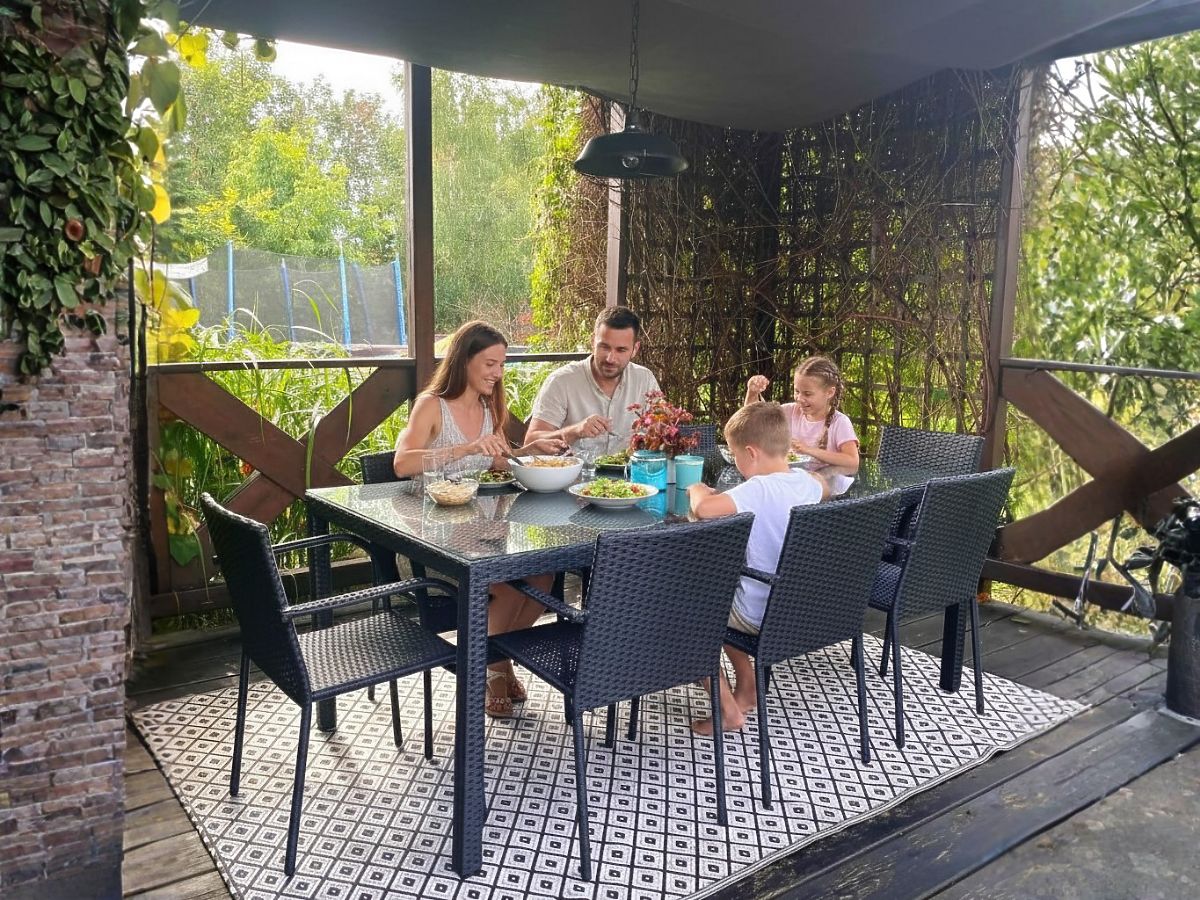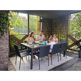 Vrtno pohištvo SOTTILE je idealna rešitev za tiste, ki cenijo eleganco, udobje in trajnost vrtnega pohištva. Jedilna garnitura za 8 oseb nudi odlične pogoje za srečanja z bližnjimi, saj združuje izjemno udobje z edinstvenim dizajnom. Vsak element vrtne garniture je izdelan iz visokokakovostnega tehnoratana, kar ne zagotavlja le dolge življenjske dobe in odpornosti na škodljive vremenske vplive, temveč tudi omogoča enostavno vzdrževanje. Izjemna natančnost izdelave poudarja luksuzni značaj pohištva, zaradi česar je tehnoratansko pohištvo SOTTILE čudovit okras vsakega zunanjega prostora. Miza s stoli je odporna na dež in UV sevanje, kar zagotavlja, da ohranijo svoj estetski videz več let in postanejo nepogrešljiv element opreme vsakega vrta, terase ali dvorišča. Barva garniture SOTTILE: črna – enotna, rahlo črtasta struktura. Pletenina: tehnoratan 7-8mm x 1,2mm. Konstrukcija pohištva: miza – aluminij, stoli – jeklo. Garnitura vsebuje 9 elementov: 1 x miza: dolžina: 200 cm, širina: 100 cm, višina: 74 cm, steklena, prozorna plošča iz 5 mm varnostnega stekla, položena na tehnoratanski pletenini. 8 x stoli: širina: 56 cm, globina: 50 cm, višina: 84 cm, višina od tal do sedeža: 44 cm, višina naslonjala od sedeža: 43 cm, širina sedeža: 40 cm, globina sedeža: 43 cm. Garnitura je poslana na 1 paleti dimenzij 120x80x210 cm, teža 80 kg. Stole je mogoče takoj uporabiti po odstranitvi iz škatel. Stoli so zložljivi (možnost vstavljanja enega v drugega), kar olajša shranjevanje in pohištvo ne zavzame veliko prostora. Miza je namenjena enostavni, samostojni montaži po priloženih navodilih. Steklena plošča mize je pritrjena na silikonskih priseskih, ki jo ščitijo pred premikanjem. Možnost nakupa blazin za stole tukaj. Tehnoratan je odporen na škodljive vremenske vplive, vendar za še daljše ohranjanje nespremenjenega videza pohištva priporočamo nakup zaščitnega pokrova. Pokrov v temno sivi barvi je enodelen in ima spodaj zatezno vrvico. Vsi pokrovi so šivani po meri in čas izdelave je približno 14 delovnih dni. Predstavljajte si vrtno pohištvo, ki presega vaša pričakovanja v vsakem pogledu – od odpornosti do dizajna. To je BELLO GIARDINO, kjer vsak detajl šteje in se luksuz sreča s funkcionalnostjo: Neuničljiva kakovost: Naš sintetični ratan zagotavlja, da bo pohištvo trajalo leta, ne da bi izgubilo na lepoti ali trajnosti. Odpornost na vreme: Naše pohištvo kljubuje najtežjim vremenskim razmeram, od žgočega sonca do mrzlih zim, ostaja vedno lepo. Luksuzno udobje: Močne, mehke blazine vabijo k sprostitvi, ponujajo udobje, ki ga je težko najti drugje. Lahkost in trdnost: Aluminijasta konstrukcija združuje najboljše iz obeh svetov – je lahka, a izjemno stabilna. Dizajn, ki očara: Vsak element našega pohištva je zasnovan z mislijo na estetiko in funkcionalnost, da se prilega vsakemu okolju. Ne glede na to, ali ste ljubitelj minimalizma ali cenite bogate, elegantne aranžmaje, naše pohištvo bo izpolnilo vaša pričakovanja, presega meje običajne funkcionalnosti in estetike. Zagotavljamo, da tudi najzahtevnejši kupci ne bodo mogli upreti udobju in slogu, ki ga ponuja BELLO GIARDINO. Spremenite svoj vrt, teraso ali balkon v oazo sprostitve in elegance, ki ste si jo vedno želeli. Ne čakajte, odkrijte BELLO GIARDINO že danes in preobrazite svoje zunanje prostore v kraje, o katerih ste vedno sanjali. Fotografije pohištva naših strank:
