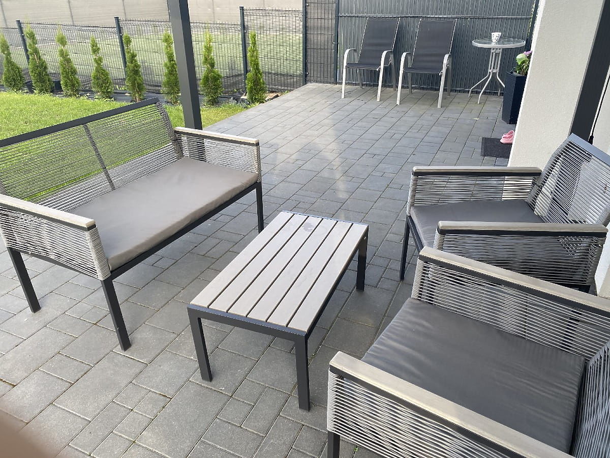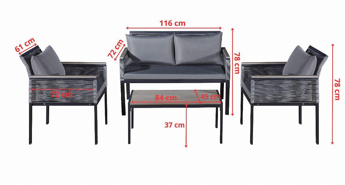 Komplet pohištva CORTO je zasnovan z mislijo na maksimalno udobje in estetiko. Je odlična izbira za tiste, ki želijo svojemu vrtu, terasi ali balkonu dodati edinstven značaj. Vrtno pohištvo CORTO ponuja združitev luksuznega udobja s klasičnim dizajnom, ta komplet je ne le udoben, ampak tudi izjemno funkcionalen, saj zavzame malo prostora. Ta balkon set ima visokokakovostno pletenje iz sintetičnega ratana, ki zagotavlja odpornost proti škodljivim vremenskim vplivom in hkrati zagotavlja dolgotrajno uporabo brez izgube estetskega videza. Komplet balkon pohištva Corto je idealna rešitev za vse, ki cenijo eleganco, trajnost in udobno sprostitev na svežem zraku, hkrati pa je stilski dodatek vsaki zunanji ureditvi. Barva kompleta CORTO: črna, enotna Pletenje: okrogli tehnoratan Konstrukcija pohištva: aluminijasta (zahteva enostavno montažo) Naslonjala za roke zaključena s polywoodom Komplet sestavljajo 4 elementi (po sestavi): 2 x stol: širina: 61 cm globina: 72 cm višina: 78 cm 1 x kavč: širina: 116 cm globina: 72 cm višina: 78 cm 1 x miza (plošča iz polywooda): dolžina: 84 cm širina: 45 cm višina: 37 cm Blazine v sivi barvi vključene v komplet (3 kosi za sedeže, 4 kosi za naslone). Vse imajo snemljive prevleke na zadrgo, izdelane iz zunanjega materiala (100% poliester), ki jih je mogoče prati pri nizkih temperaturah. Prevleke za blazine so narejene iz visokokakovostne tkanine, prevlečene s teflonom, ki jih ščiti pred vlago. Polnilo blazin je izdelano iz visokokakovostne oblazinjene pene (srednje trde - T25), ki preprečuje deformacije. Debelina blazin: 5 cm Možnost šivanja blazin po naročilu za ta komplet: https://www.bg-meble.pl/pl/p/Usluga-Krawiecka-Poduszki-Na-Zamowienie-/742 Možnost šivanja prevlek za blazine po naročilu za ta komplet: https://www.bg-meble.pl/pl/p/Usluga-Krawiecka-Poszewki-Na-Zamowienie/743 Možnost naročila le celotnega kompleta. Komplet za samostojno montažo po priloženih navodilih. Komplet vsebuje celoten set vijakov in ključev. Tehnoratan je odporen na škodljive vremenske vplive, vendar za še daljše ohranjanje nespremenjenega videza pohištva priporočamo nakup zaščitne prevleke. Prevleka v temno sivi barvi je enodelna in ima spodaj zatezno vrvico, speljano skozi kovinska očesca. Vse prevleke so narejene po meri in čas izdelave je približno 14 delovnih dni. Predstavljajte si vrtno pohištvo, ki presega vaša pričakovanja v vsakem pogledu – od odpornosti do dizajna. Tukaj je BELLO GIARDINO, kjer ima vsak detajl pomen in se luksuz sreča s funkcionalnostjo: Neprekinjena kakovost: Naš sintetični ratan je zagotovilo, da bo pohištvo zdržalo leta, ne da bi izgubilo na lepoti ali trajnosti. Odpornost na vreme: Naše pohištvo se sooča z najtežjimi vremenskimi pogoji, od žgočega sonca do mrzlih zim, ostaja vedno lepo. Luksuzno udobje: Močne, mehke blazine vabijo k sprostitvi, ponujajo udobje, ki ga je težko najti drugje. Lahkost in trdnost: Aluminijasta konstrukcija združuje najboljše iz obeh svetov – je lahka, a izjemno stabilna. Dizajn, ki očara: Vsak element našega pohištva je zasnovan z mislijo na estetiko in funkcionalnost, da se prilega vsakemu okolju. Ne glede na to, ali ste ljubitelj minimalizma ali cenite bogate, elegantne ureditve, naše pohištvo bo izpolnilo vaša pričakovanja, presega meje običajne funkcionalnosti in estetike. Zagotavljamo, da tudi najzahtevnejši kupci ne bodo mogli upreti udobju in stilu, ki ga ponuja BELLO GIARDINO. Naredite svoj vrt, teraso ali balkon oazo sprostitve in elegance, ki ste jo vedno želeli imeti. Ne čakajte, odkrijte BELLO GIARDINO že danes in spremenite svoje zunanje prostore v kraje, o katerih ste vedno sanjali.