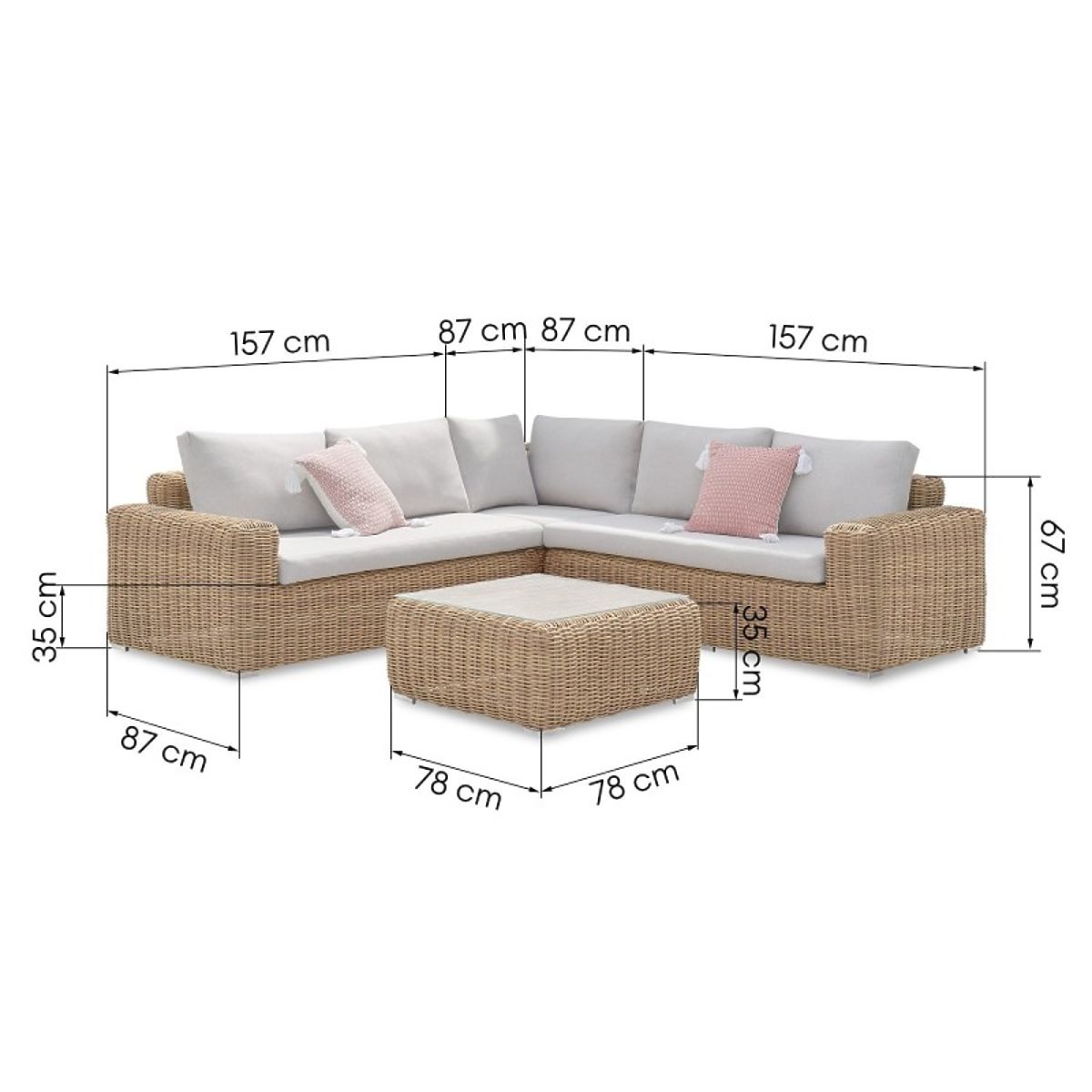 Vrtna kotna sedežna garnitura Sandy je elegantna počivalna garnitura s priročnim stolom in mehkimi blazinami, idealna za sprostitev na vrtu. Izdelana je iz odpornega sintetičnega ratana, združuje stil in udobje ter se odlično prilega vsakemu zunanjemu prostoru.