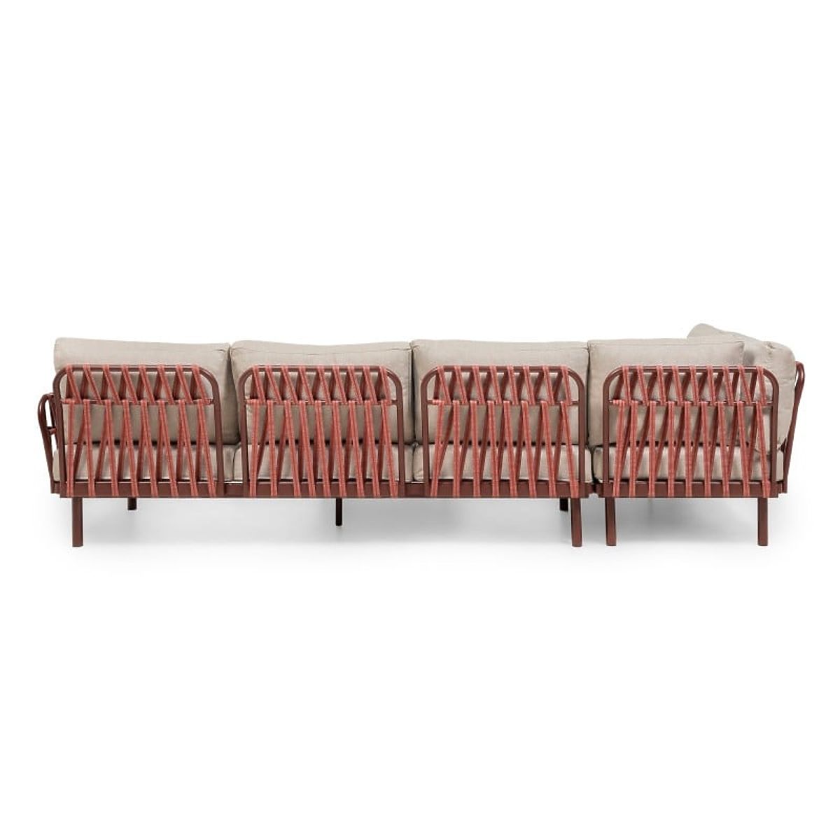 Kotna sedežna garnitura Amarello – nežna eleganca v harmonični obliki. Aluminijasta konstrukcija v rdeče-rjavem odtenku, odporna pletenina in udobni blazini ustvarjajo prefinjen prostor za počitek, dopolnjen s praktično mizico in stransko polico.