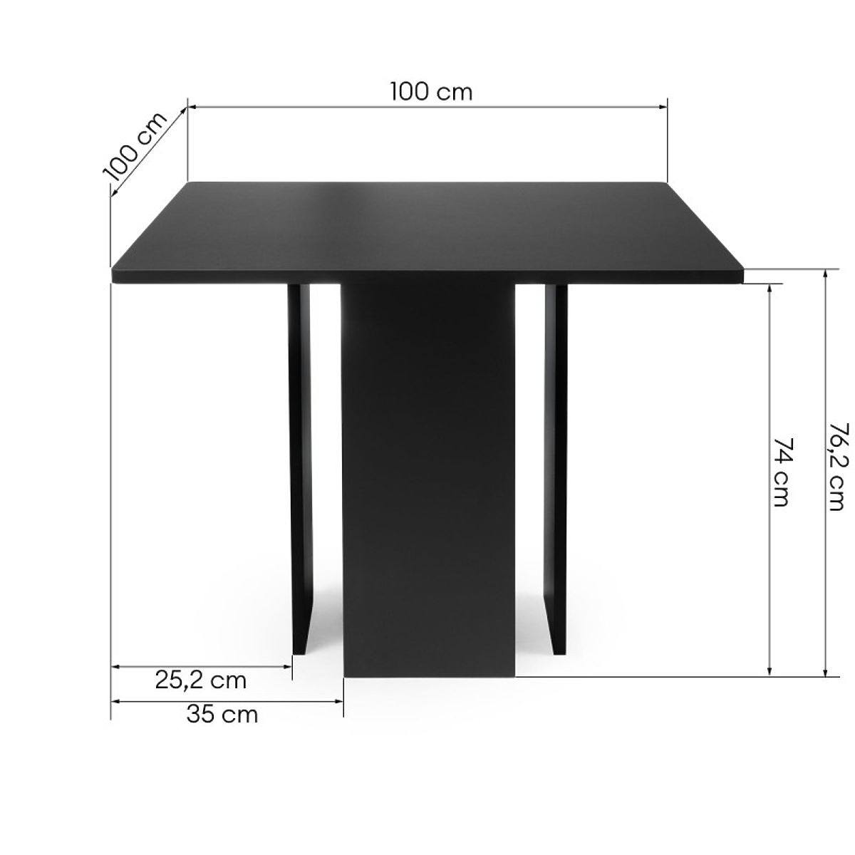 Miza Gasper se ponaša z moderno obliko v globoki črni barvi. Njena kvadratna plošča je nameščena na značilni osnovi, ki zagotavlja stabilnost in edinstven videz. Ta projekt je namenjen ljubiteljem minimalizma, ki iščejo preprosto, a izrazito pohištvo za svojo jedilnico.