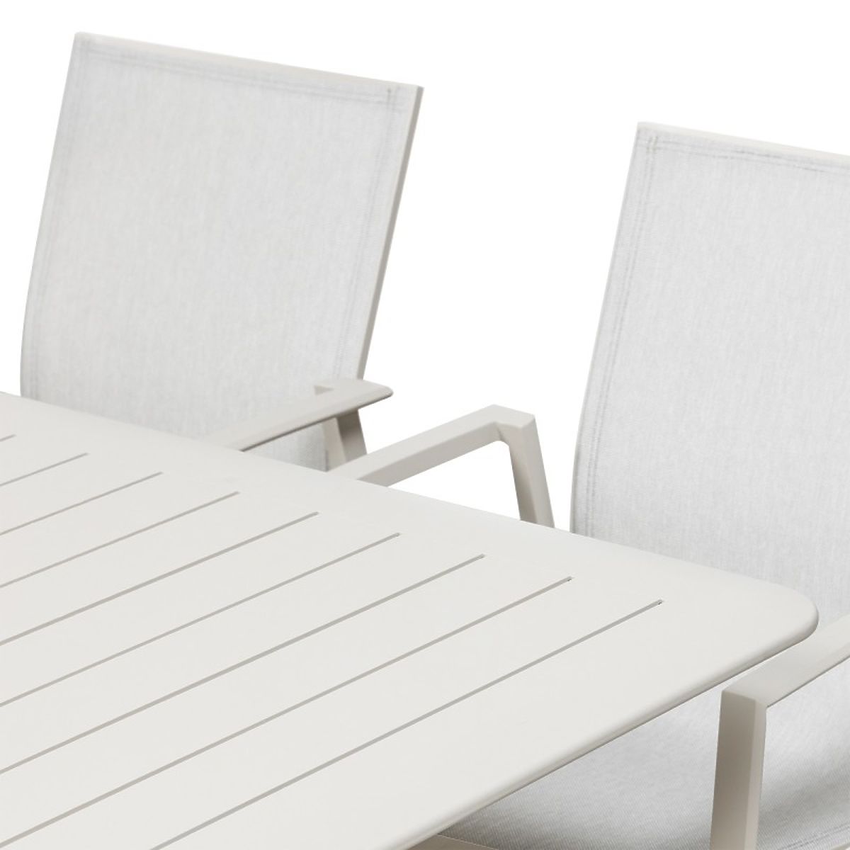 Canelli je vrtni set, ustvarjen z mislijo na sodobne prostore in udobno sprostitev. Aluminijasta konstrukcija v nežnem odtenku bež barve združuje eleganco z odpornostjo, odlično se obnese v spremenljivih vremenskih razmerah. Zahvaljujoč funkciji raztegljive mize boste zlahka pripravili prostor za večja srečanja in skupne trenutke na svežem zraku.