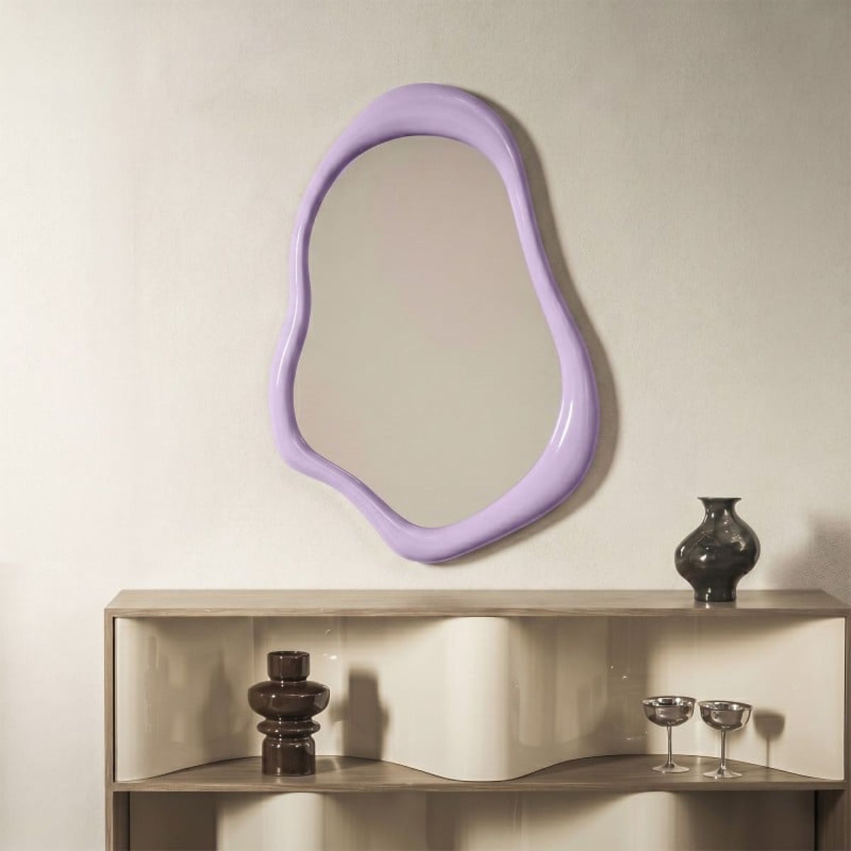Ogledalo Maluma je stilski dekorativni element, ki pritegne pozornost na prvi pogled. Nepravilni okvir iz lila MDF plošče, dokončan v visokem sijaju, prostoru dodaja značaj, energijo in moderno eleganco. Idealno za interierje, ki želijo izstopati.